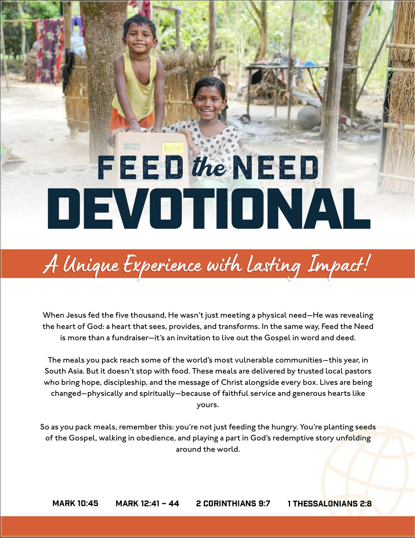 This campaign provides a rare opportunity to bring the experience of an overseas mission trip to your campus. Feed the Need allows your students to fulfill a physical need by packing meals while sharing the Good News of Jesus Christ.
