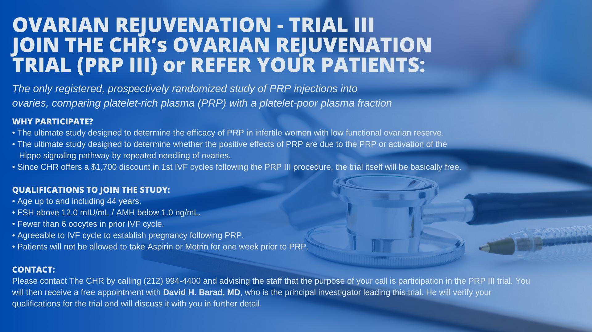 We in this issue also draw attention again to the clinical trials of intra-ovarian PRP injections at the CHR. Three studies are currently ongoing addressing this treatment, by some also called “ovarian rejuvenation,” under the heading PRP-I, II, and III. A first preliminary report on PRP-II was already published¹ (though the study is continuing). PRP-I and PRP-III , however, still need additional patients. PRP-I is restricted to women with early menopause before age 40, while PRP-III is open to all women up to age 45.