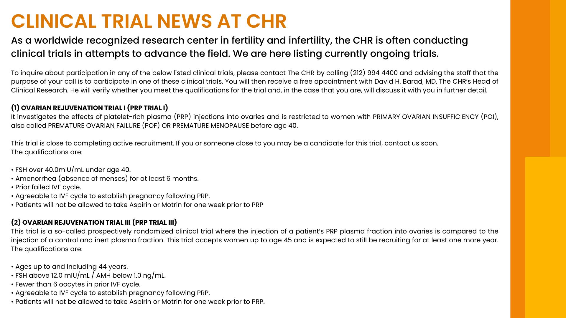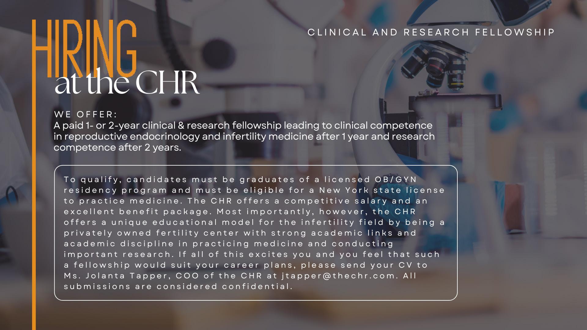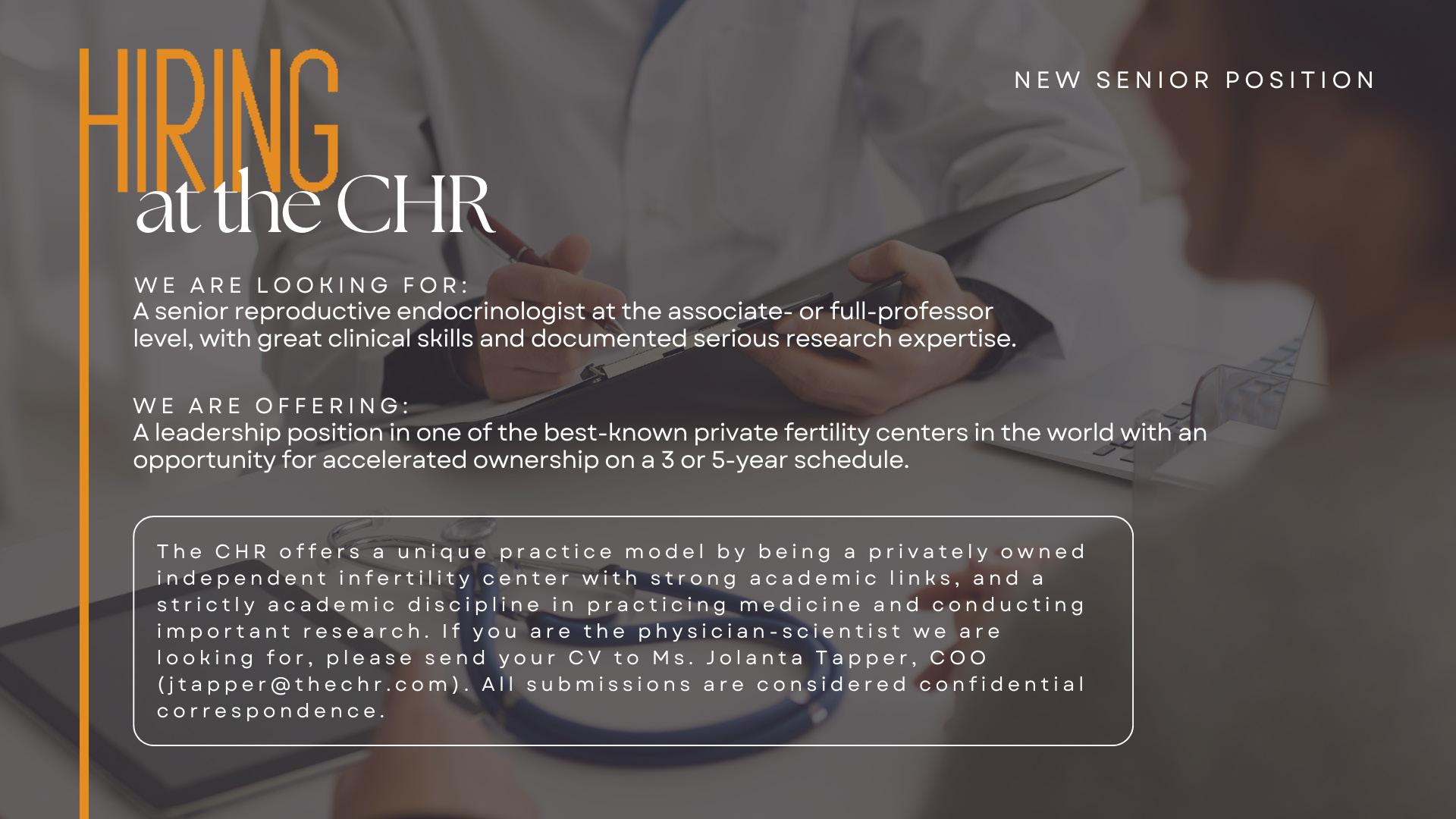 The CHR is known as a “fertility center of last resort,” primarily serving patients who have previously failed treatments elsewhere. Among CHR’s areas of special expertise are treatments of “older” ovaries, whether due to advanced female age or premature ovarian aging (POA), immunological problems affecting reproduction, repeated pregnancy loss, endometriosis, polycystic ovary syndrome (PCOS), tubal disease, male factor infertility, etc.