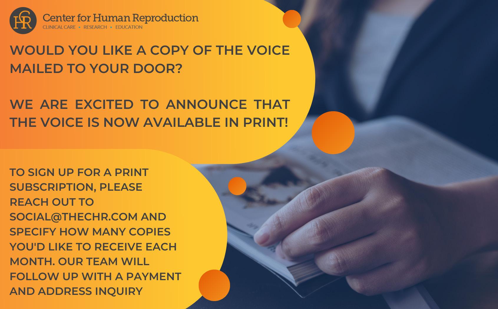 The CHR VOICE is the newsletter of The Center for Human Reproduction (CHR), an independent, academically affiliated infertility and research center located at 21 East 69th Street in Manhattan, New York, N.Y 10021. www.centerforhumanreprod.com. Telephone +212 994 4400. The CHR VOICE attempts to inform and engage a global community of infertility patients, infertility service providers, and researchers in reproductive medicine, physiology, and biology. The mission of The CHR is clinical care, research, and education, all at highest standards, with empathy, honesty, integrity, and equity.The newsletter is published 10 times a year (except July and August). Copyright © 2023 by The CHR. All rights reserved. Print ISSN 2836-3086. Online ISSN 2836-3094. Copyright © 2023 by The CHR. All rights reserved.