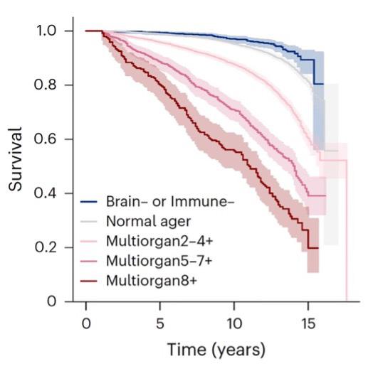 Remarkably, the accrual of aged organs progressively increases mortality risk, while a youthful brain and immune system are uniquely associated with diseasefree longevity (see figures to the right). These findings support the use of plasma proteins for monitoring organ health and the efficacy of drugs targeting organ aging disease, and found the brain and immune system clocks to be most influential.