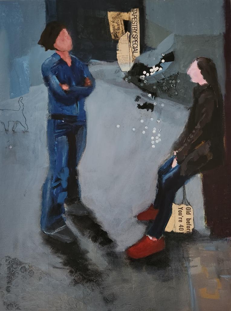 Christina Walker is a mixed media artist, expressing her experiences of living in different countries, overcoming adversity, prejudice, and uncertainty in her art. Her abstracted portraits and figurative pieces contemplate relationships and the question of, is interpersonal communication possible at all. Using acrylics with collage and other media these abstracted figurative paintings depict the same characters but tell a different story due to the choice of colour, composition, and words. “I am a storyteller at heart. And I love to watch people. I am interested in their relationships and how they communicate. What are they talking about? Who is asking and who is answering? Are they friends or foe? Happy or unhappy? And any thoughts and feelings and ponderings that arise in the process, I ban on the canvas, paper, or board. Art, for me, is very personal.”