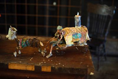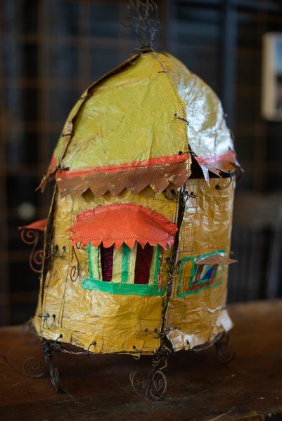 Timber and glass picture frames are recycled and painted from the underside making the surface durable and shiny. Fairy houses and horse drawn wagons using repurposed papers are processed by momigami technique, paper mâche wire cardboard armature. The glass vessel is painted in reverse to form unique decorative décor.