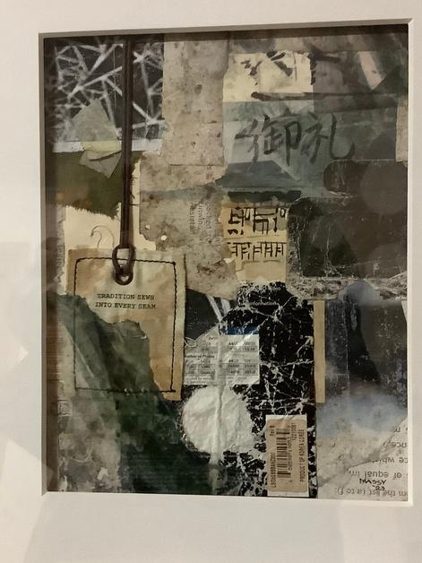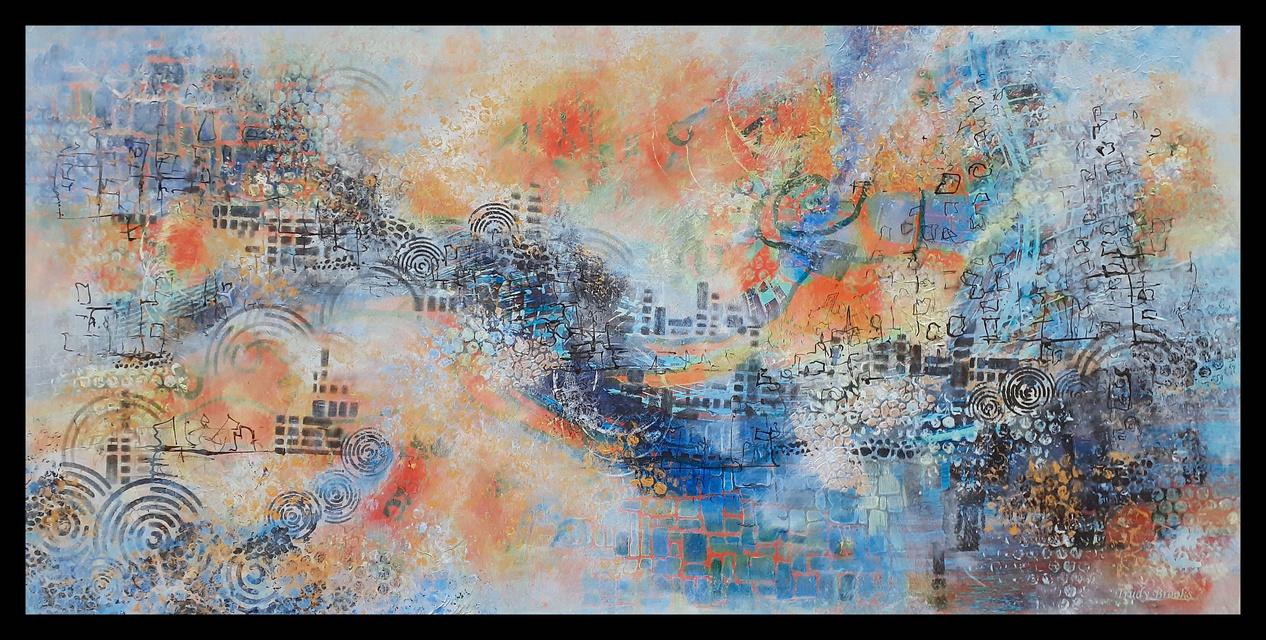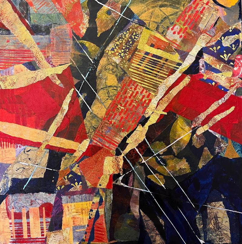 Printed fragments of rice paper are collaged in this work on canvas. Colour and texture combine to question direction, “what’s ahead”.