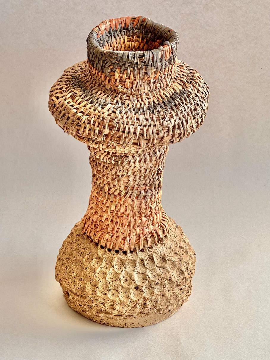 Foraged plant material is used as the core for it’s beautiful contoured shape. It is hand stitched with hand-dyed raffia over a rustic textual clay base.