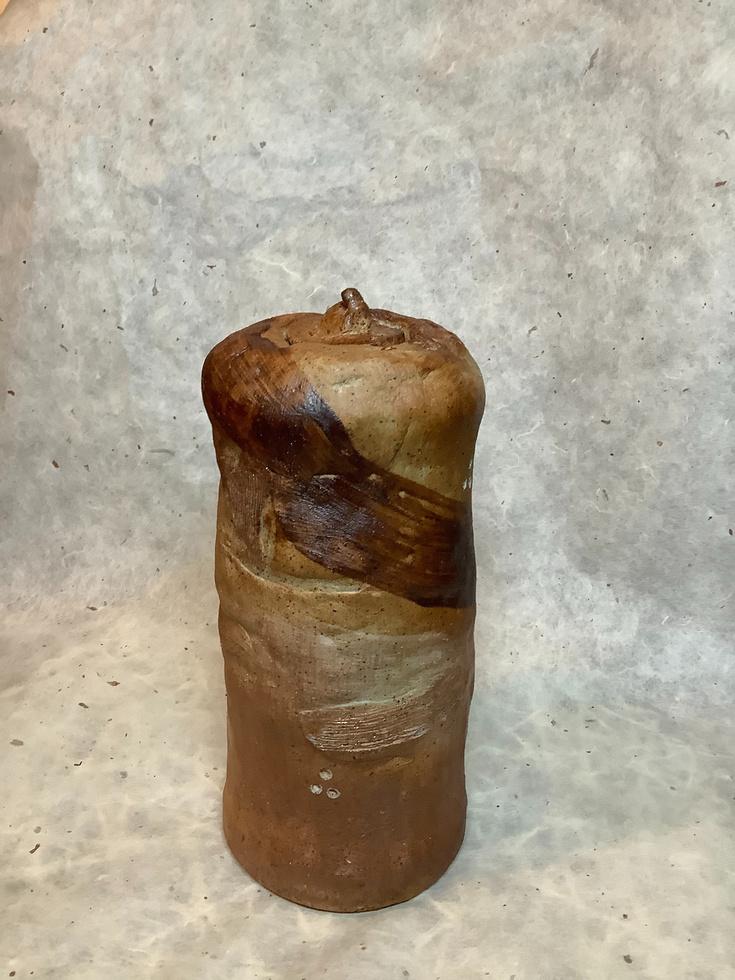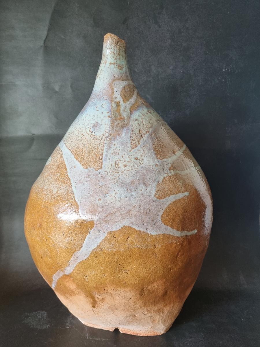 Hand built Earthenware vessel. Multiple glazes sprayed in various thicknesses along with poured ash glaze, 55cm