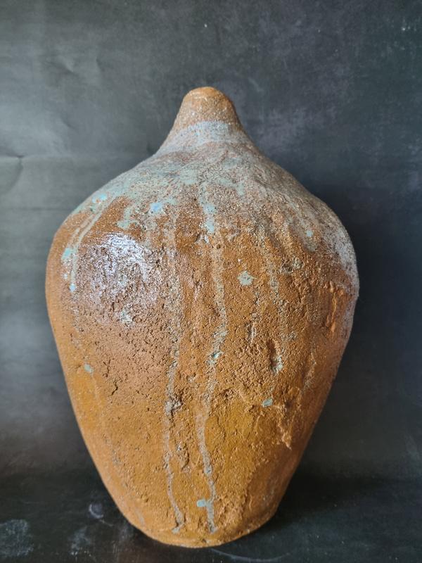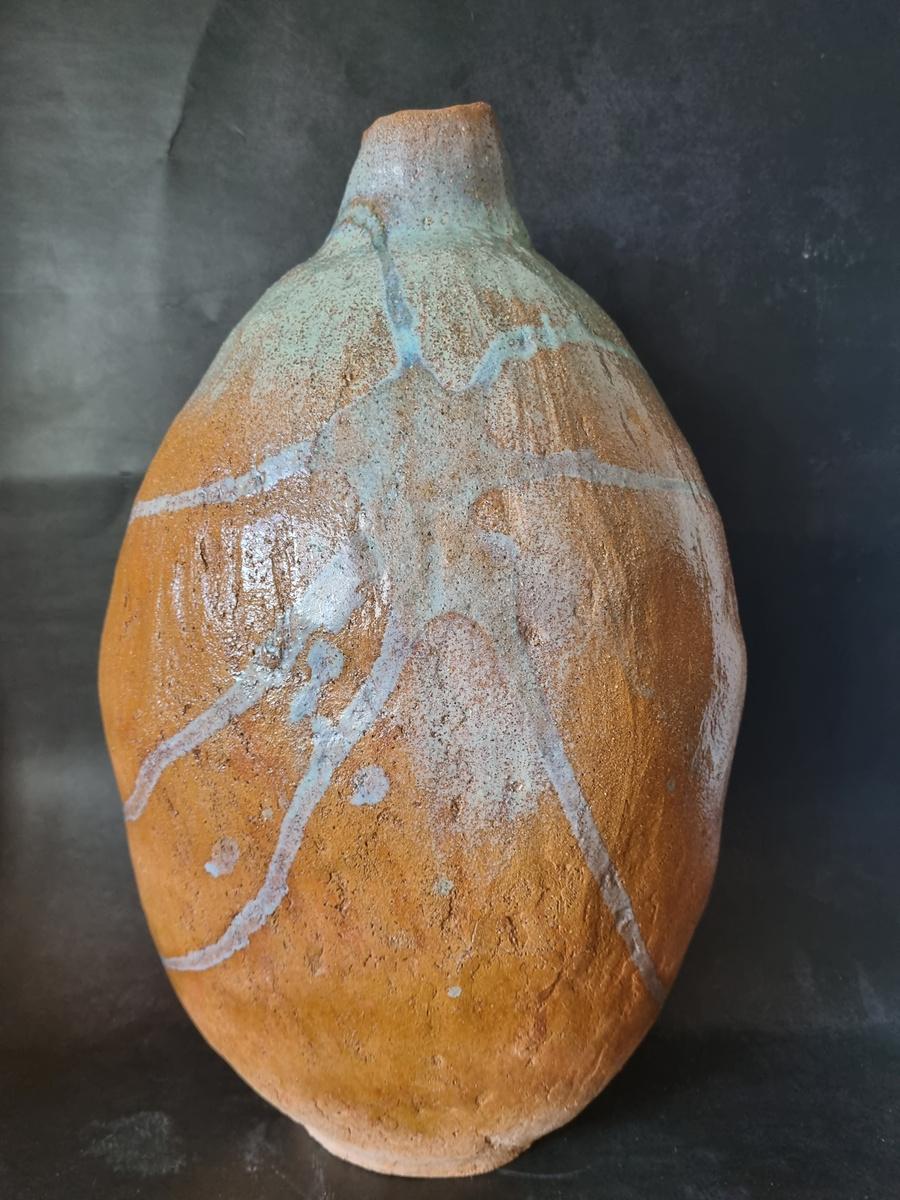 Hand built Earthenware vessel. Multiple glazes sprayed in various thicknesses along with poured ash glaze, 40cm