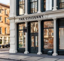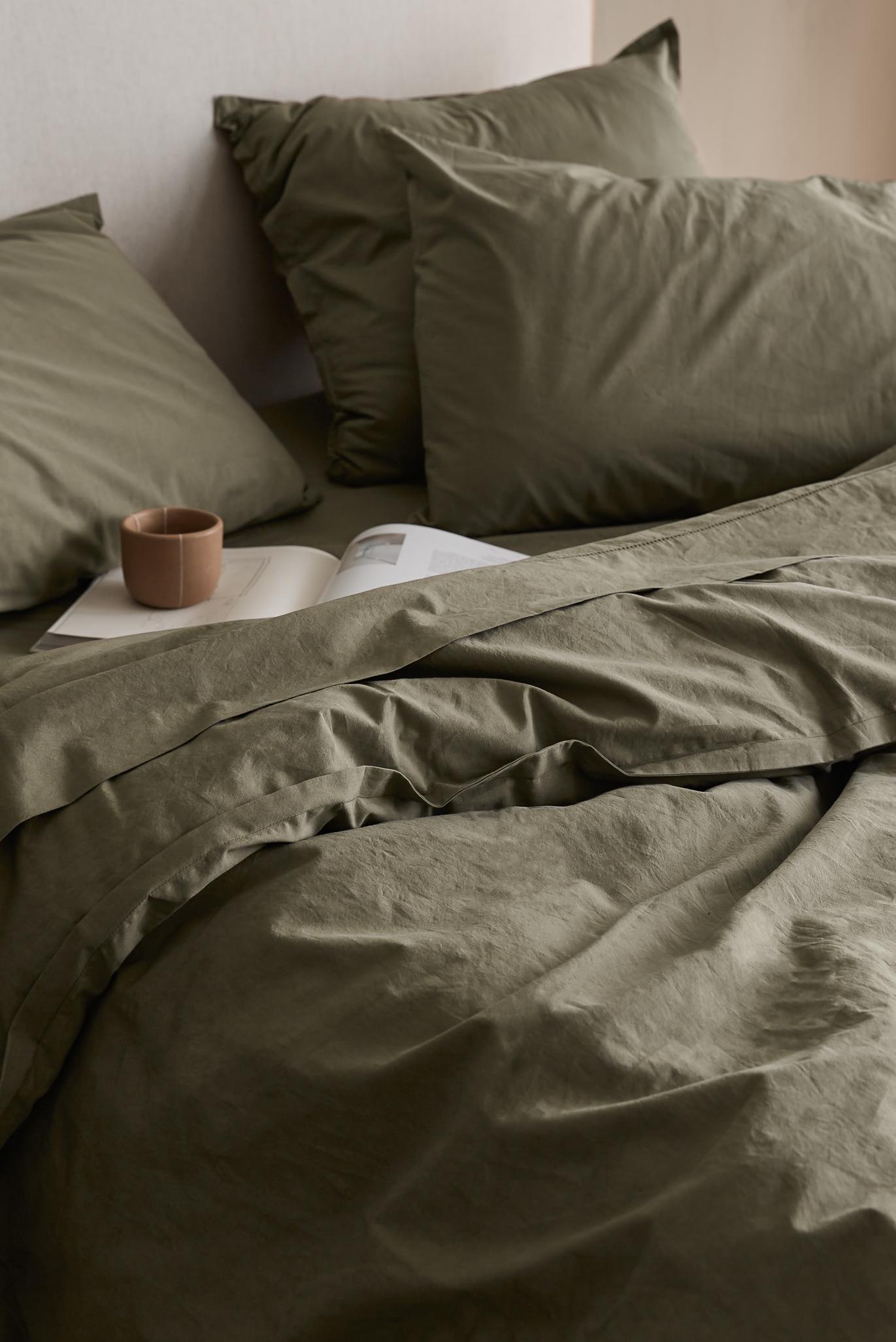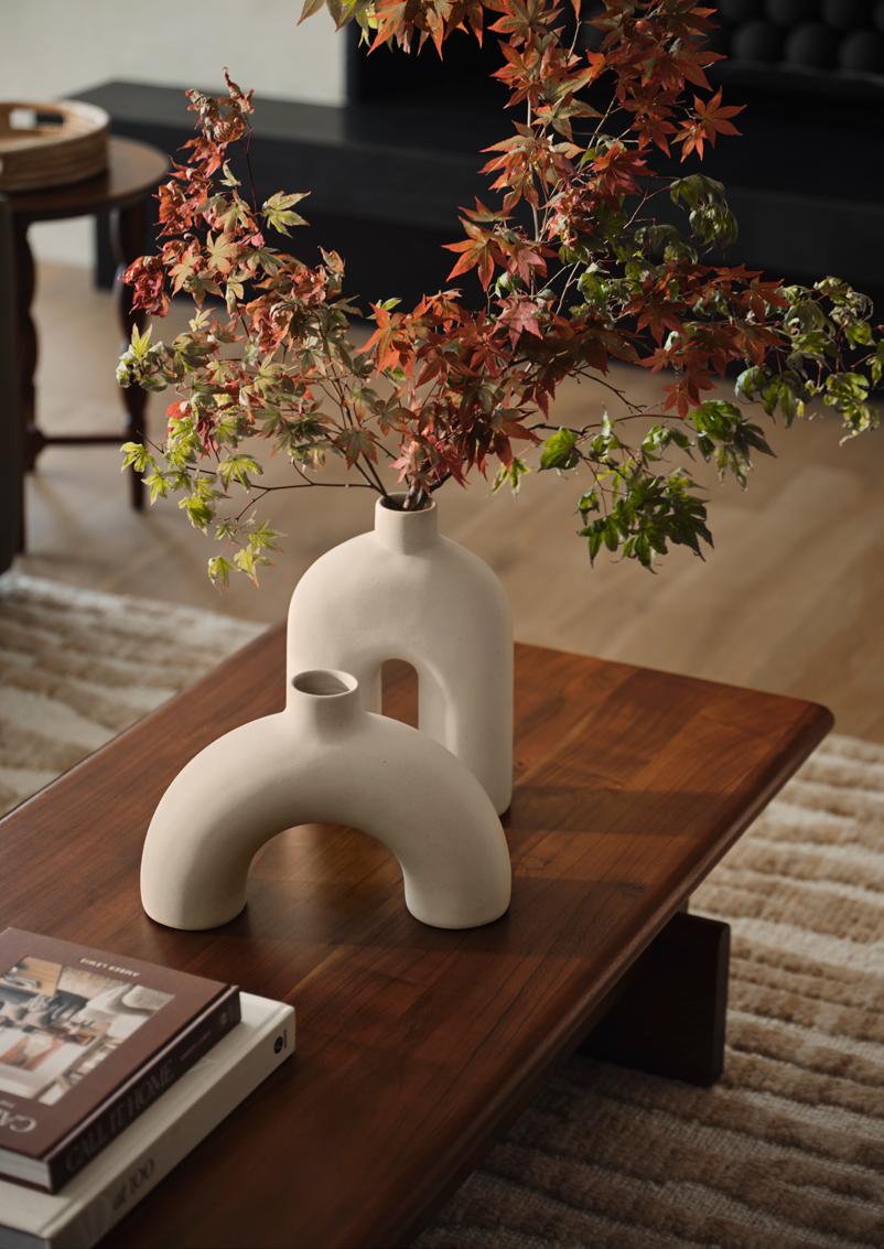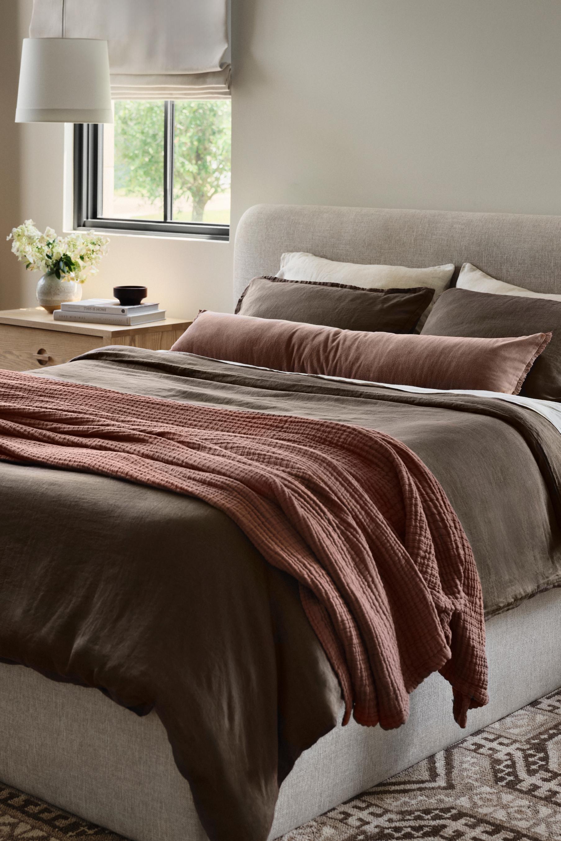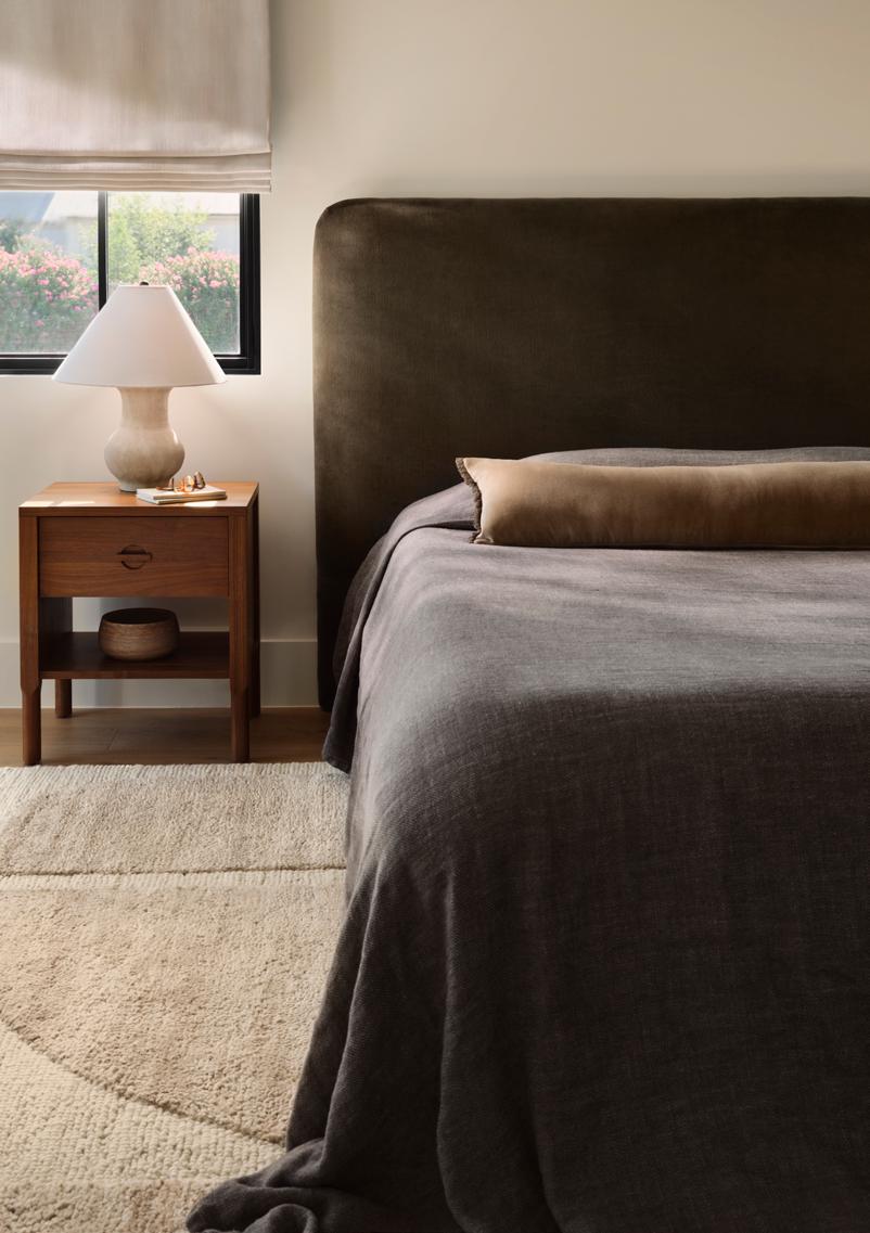 C | Alpine Bed with Tall Headboard in Cotton Velvet in Mushroom from $2,599, Censo Linen Bed Blanket in Charcoal $269, Naveta Velvet Lumbar Pillow in Moss $149, Avon Nightstand in Natural Walnut $1,599, Tara Handwoven Area Rug from $1,299 D | Nayani Wood Coffee Table $999, Vati Vases from $79, Zaha Hand-Knotted Area Rug from $1,399