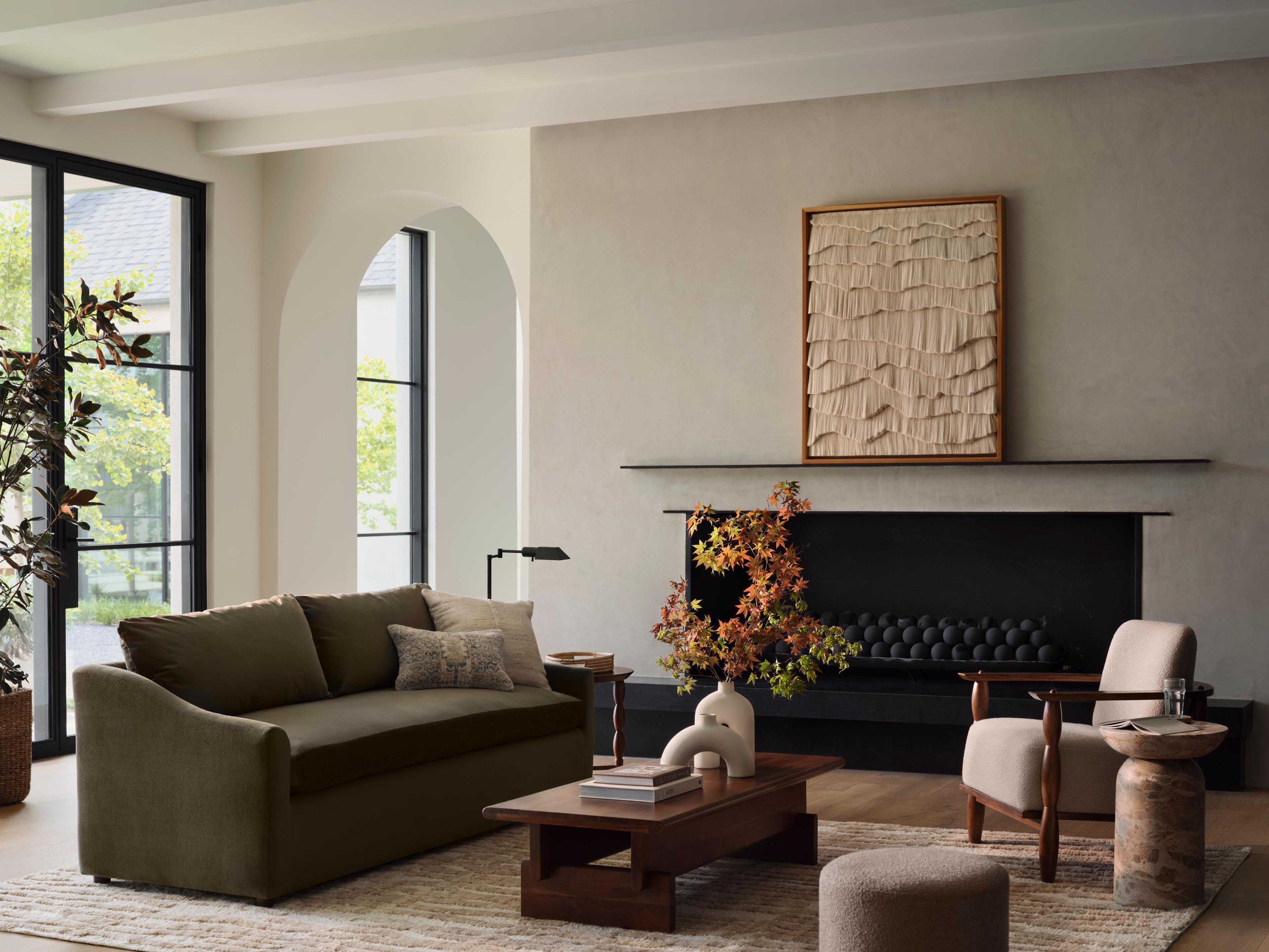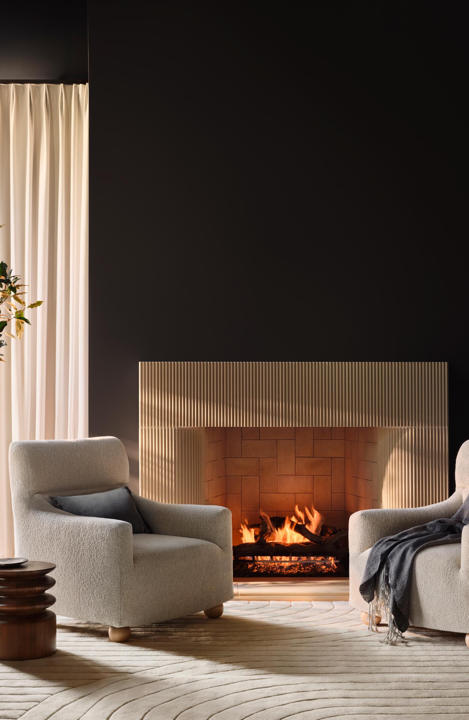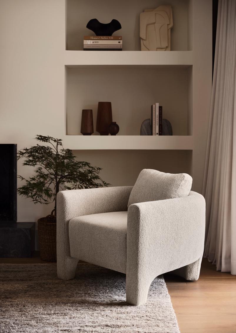 B | Riven Armchair in Performance Linen in Pearl from $1,599, Lalli Handwoven Area Rug from $999, Mirador Ceramic Wall Art $599