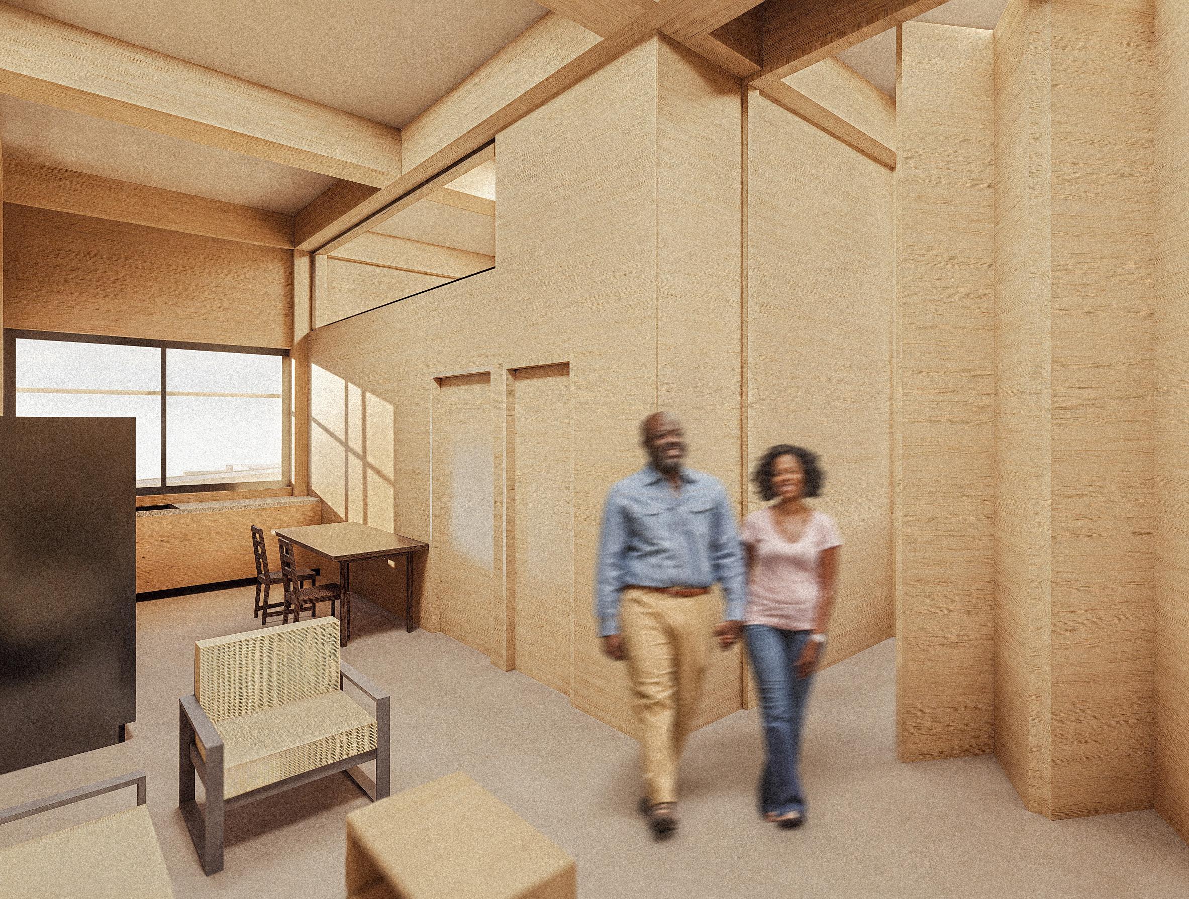 The upper residential layer introduces three housing typologies—couple units, family units, and studio apartments— each designed to accommodate different stages of life and patterns of living within the same vertical community. Adjacent to the residences, a co-working office space provides a flexible environment for work, collaboration, and creative production