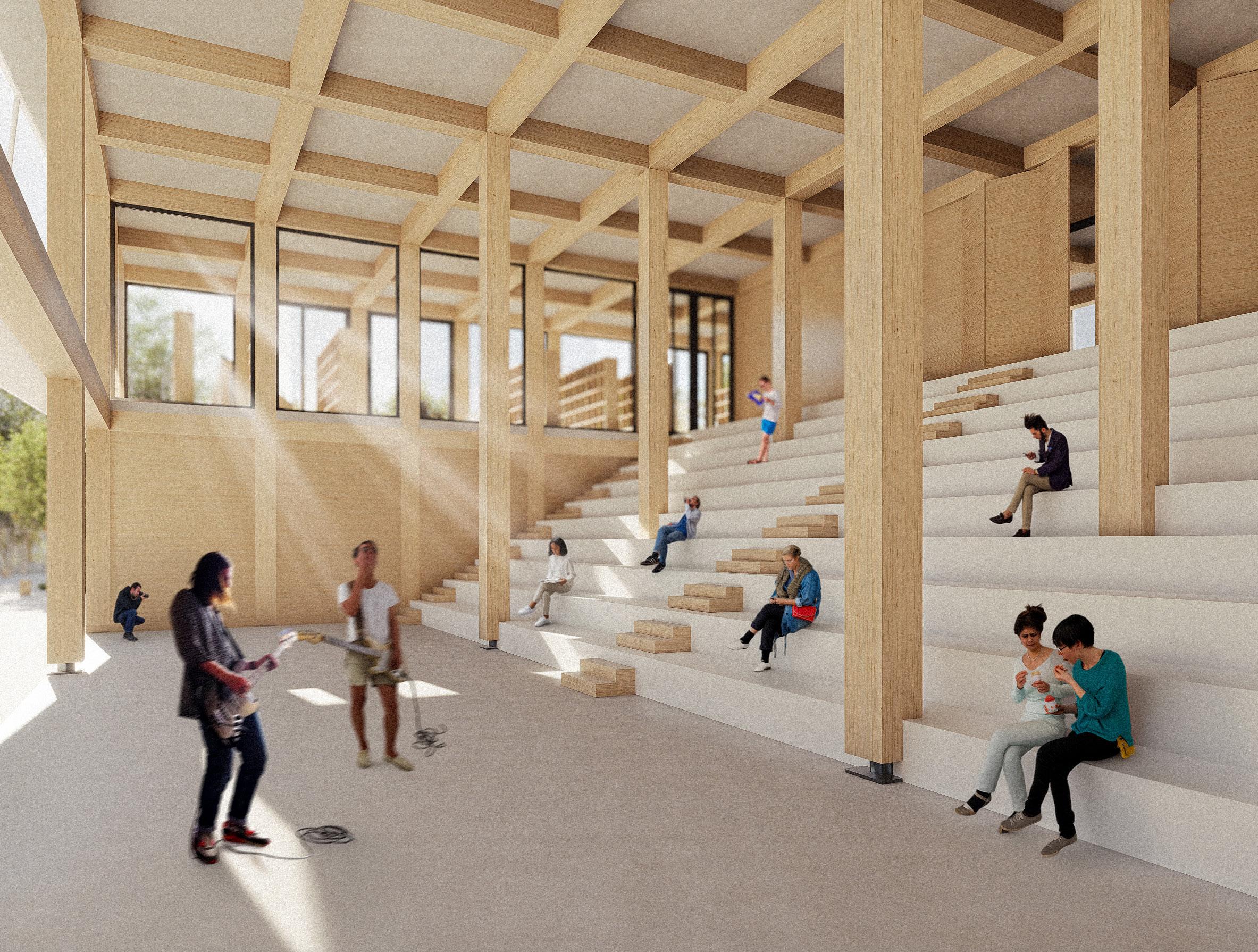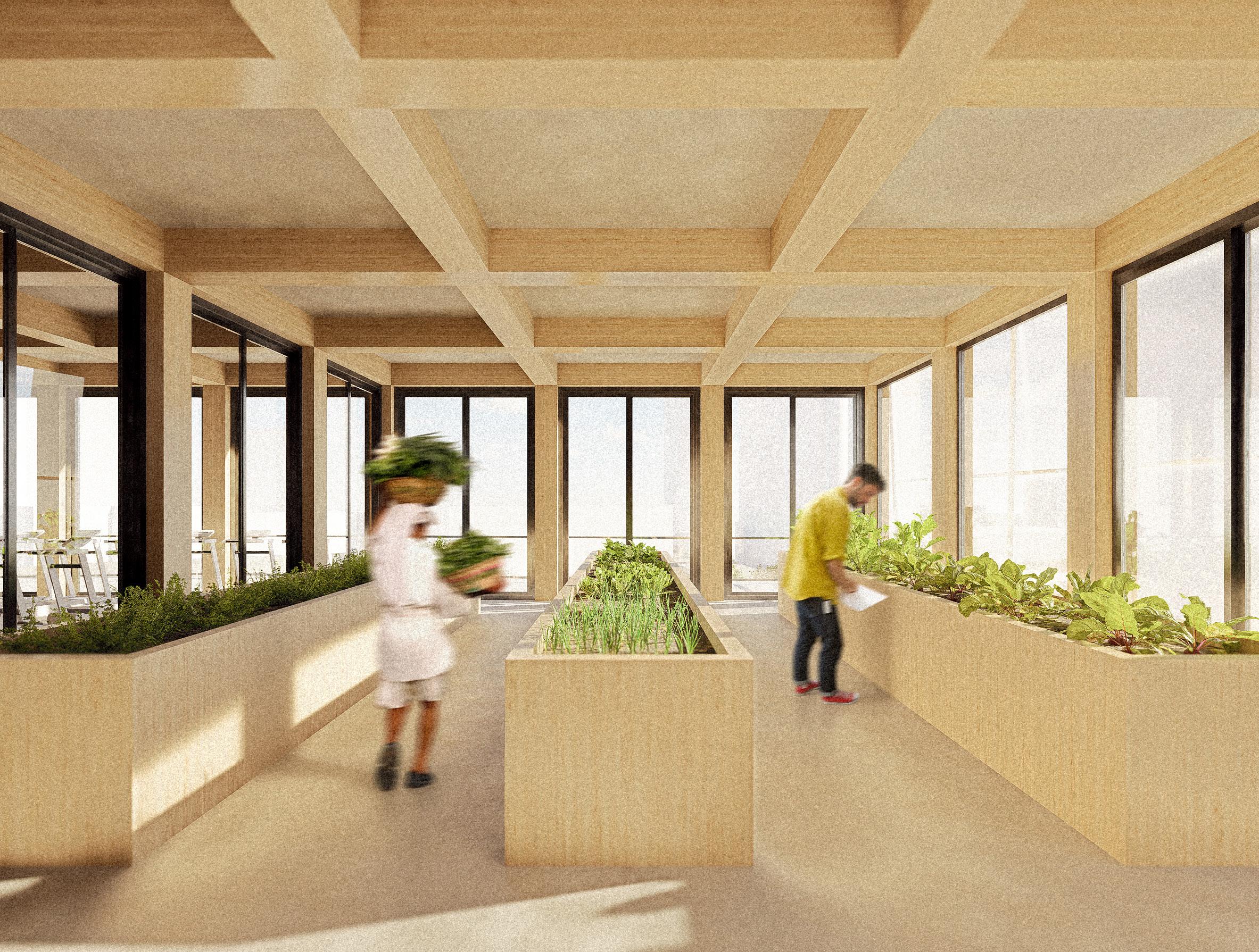 On the ground floor, the architecture opens itself to the city as an extension of the public space. A community kitchen, workshops, brewery, art gallery, and generous lobbies form a dynamic interior landscape where everyday life and creative expression intertwine.