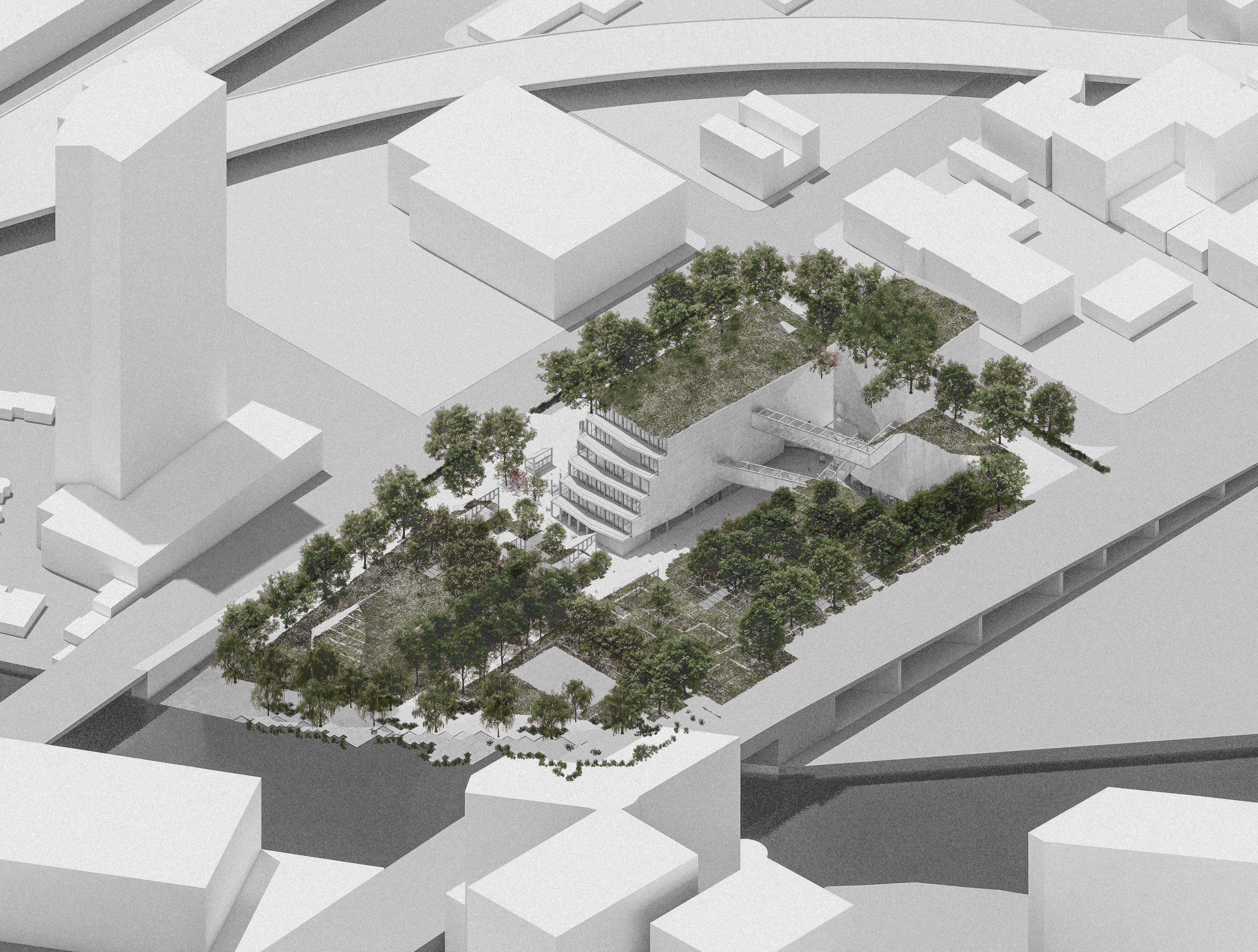 The programs dissolve outward through multiple thresholds and transparent boundaries, connecting seamlessly to a site filled with public green spaces that act as urban breathing rooms and social anchors. Rather than enclosing, the building releases. The ground level becomes a shared terrain where collective life can be maintained.