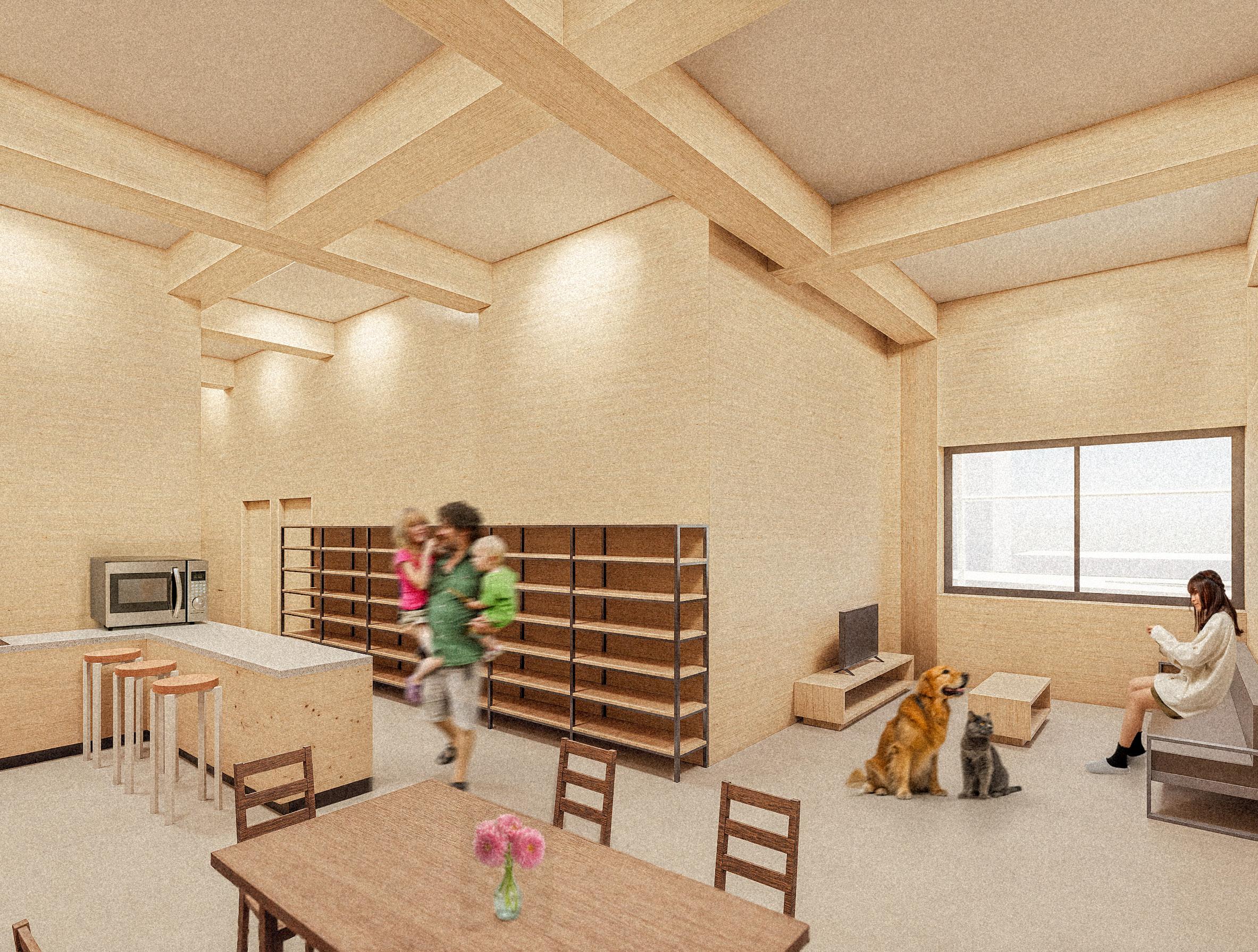 Housing units are organized around communal spaces that include indoor farming areas for fresh, on-site food production, a fully equipped gym that promotes health and well-being, and a central washing center that streamlines daily chores. These shared facilities not only maximize space efficiency within the building but also encourage social interaction, sustainability, and a more connected way of living for all residents.