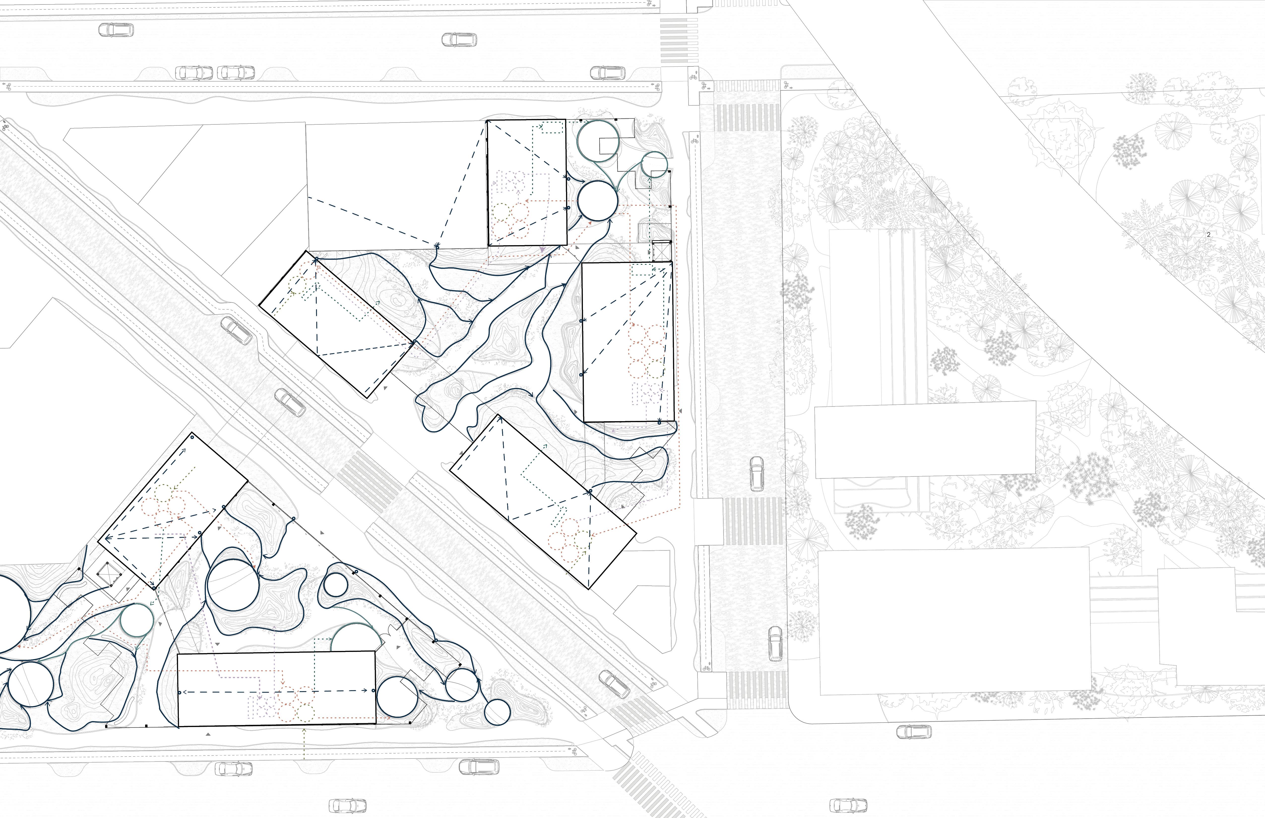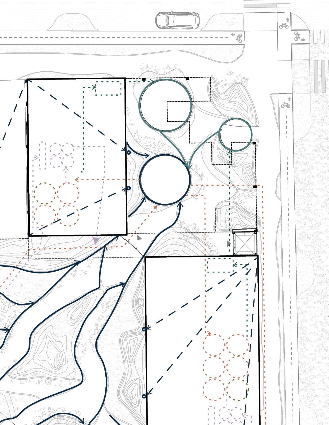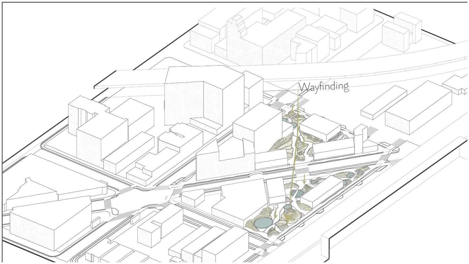 Placemnet of an immersive topography that guides wayfinding, complemented by the visual presence of water.