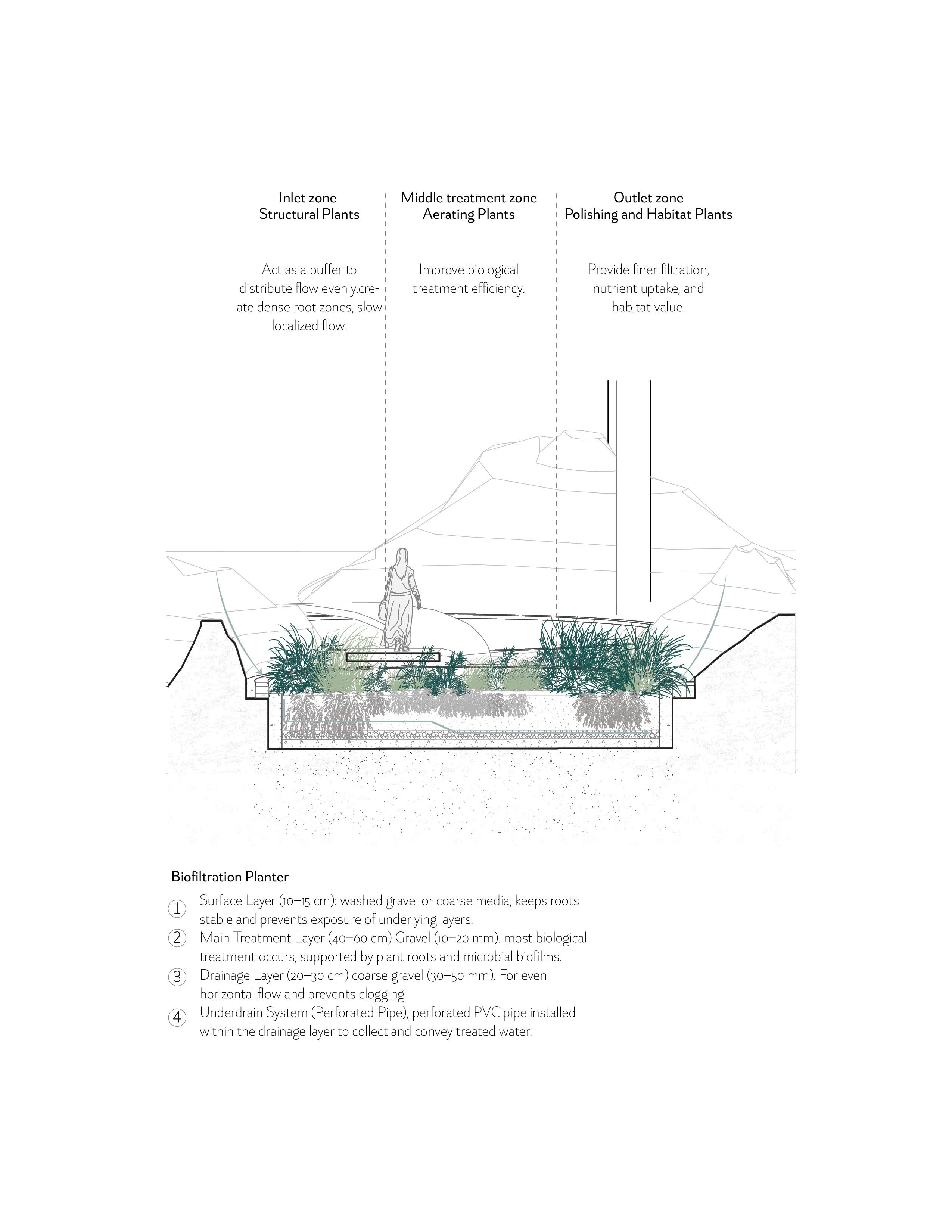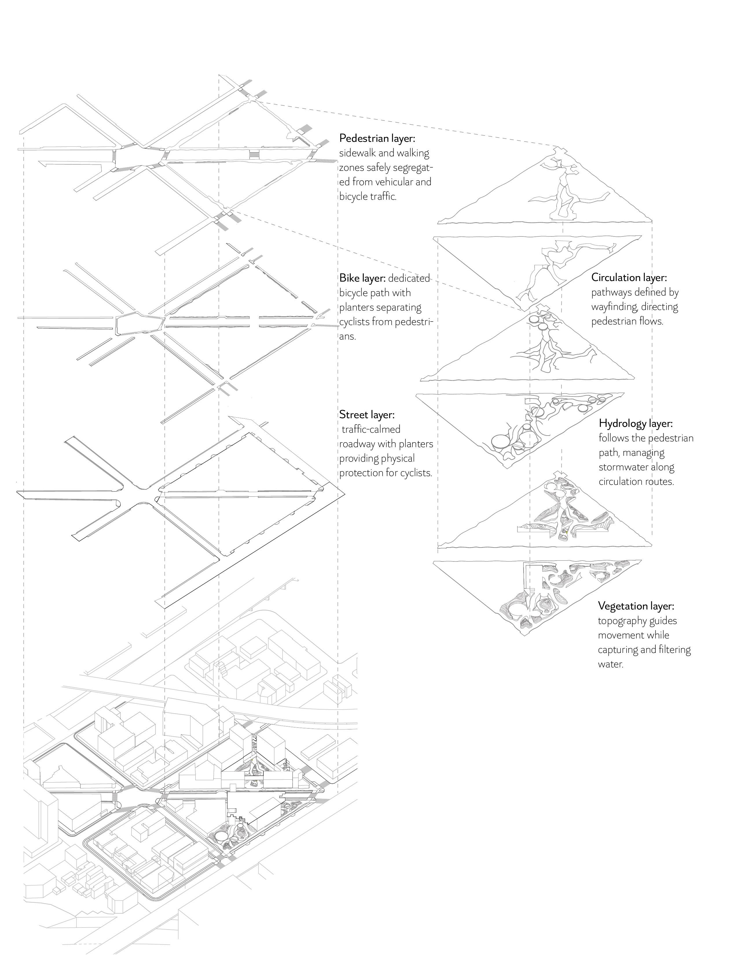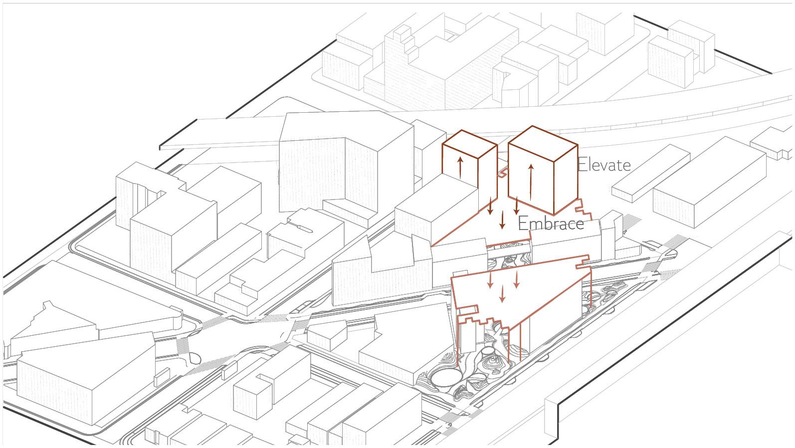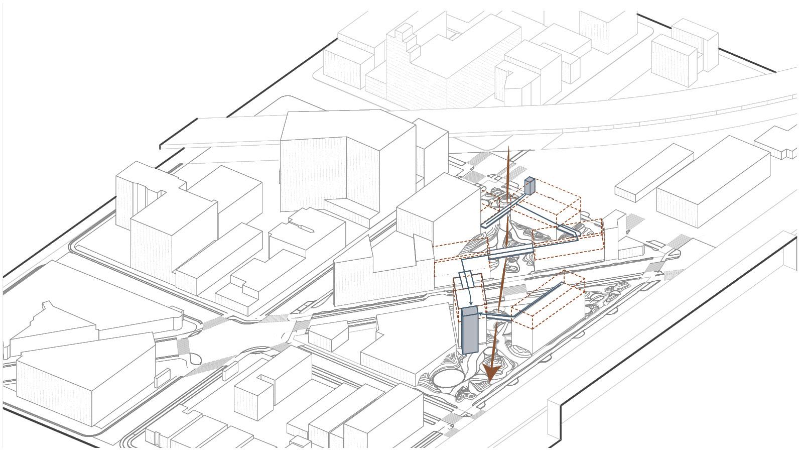Placemnet of an immersive topography that guides wayfinding, complemented by the visual presence of water.