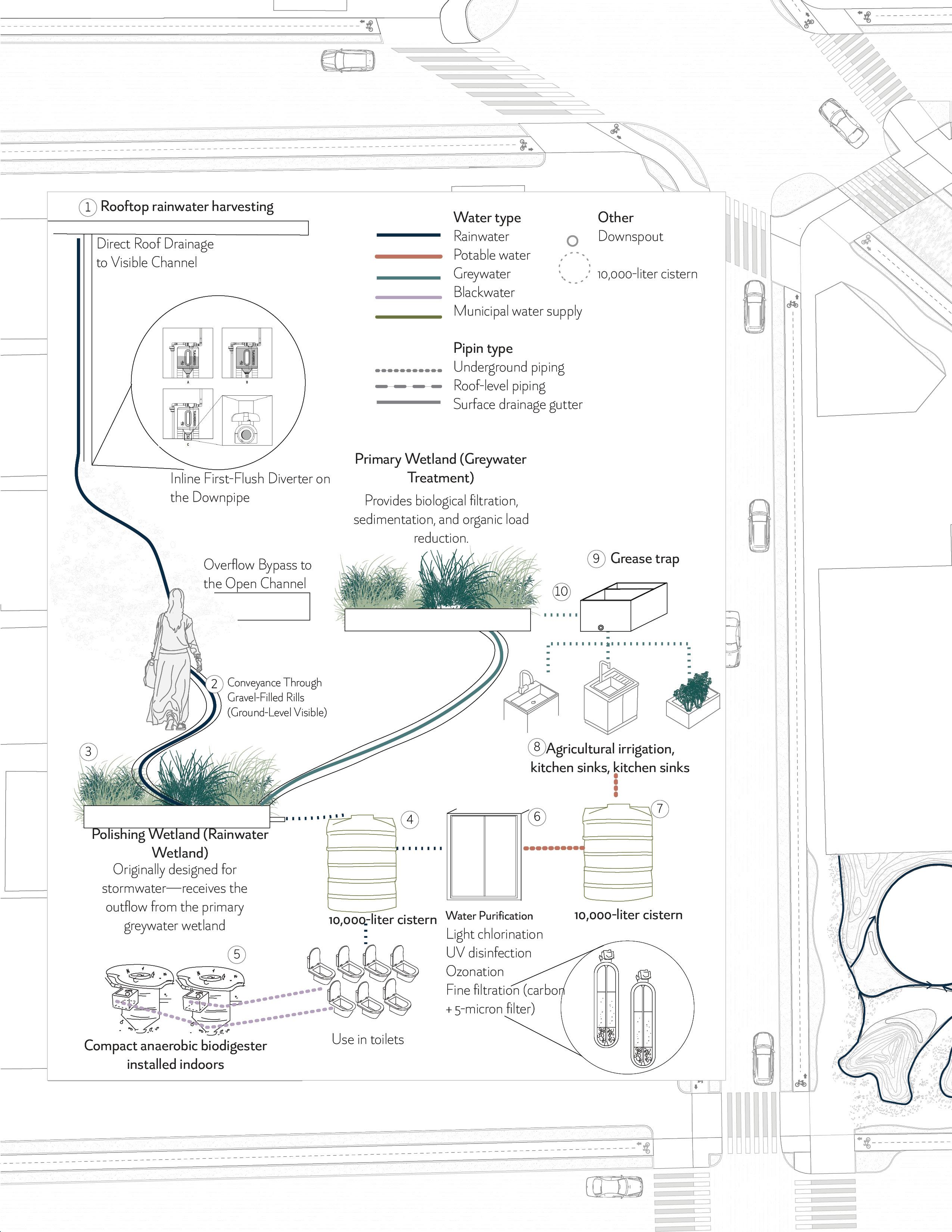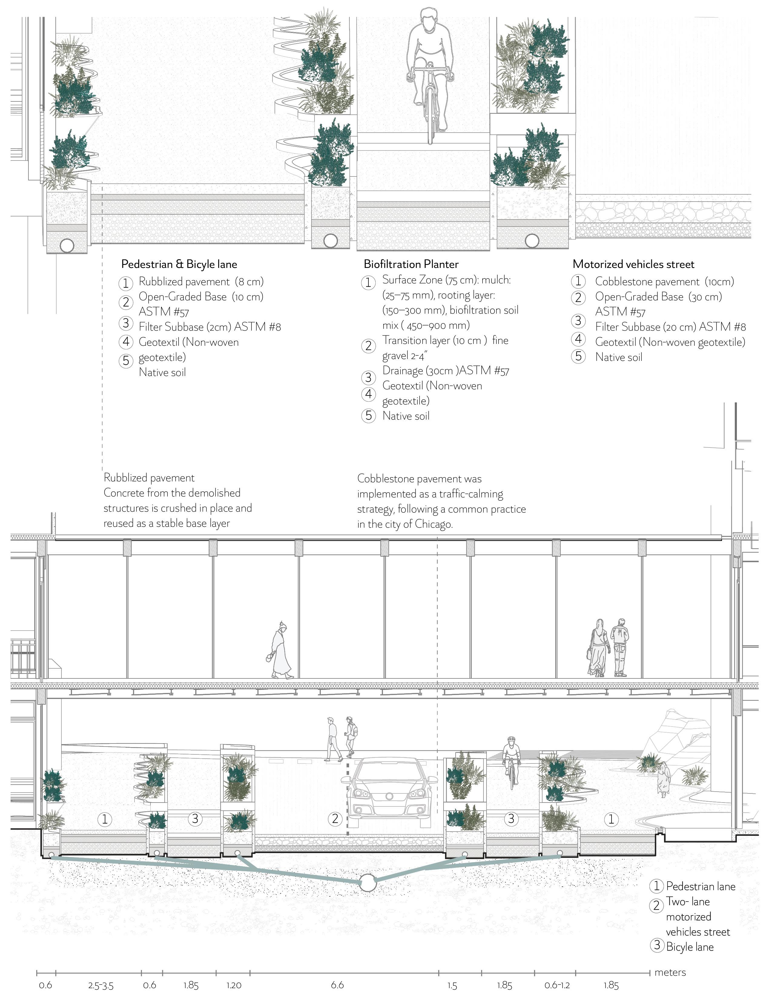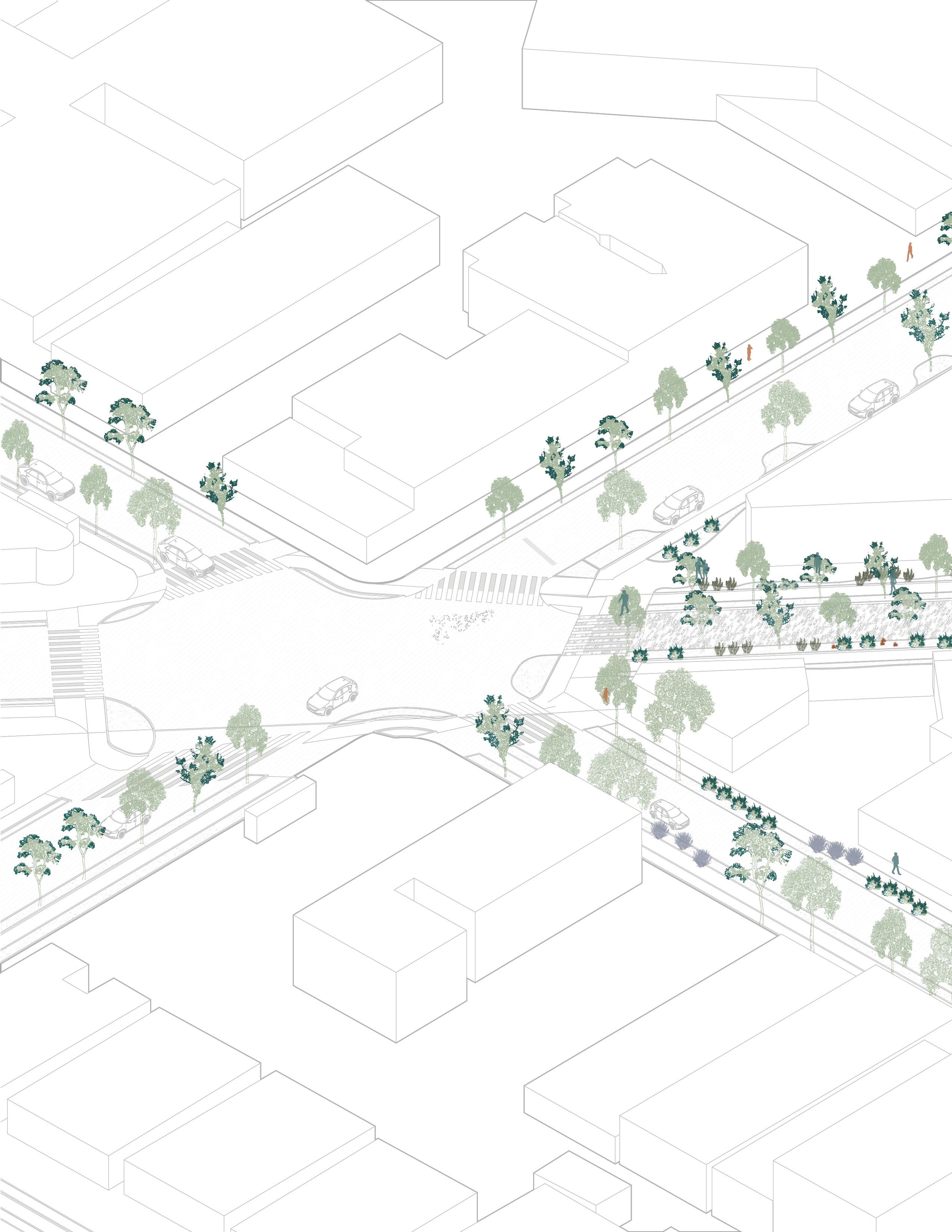 Water, vegetation, mobility, and street treatments operate together to build a resilient and accessible edge.