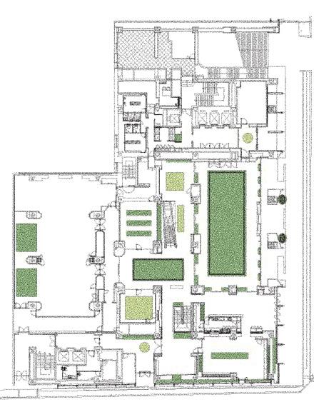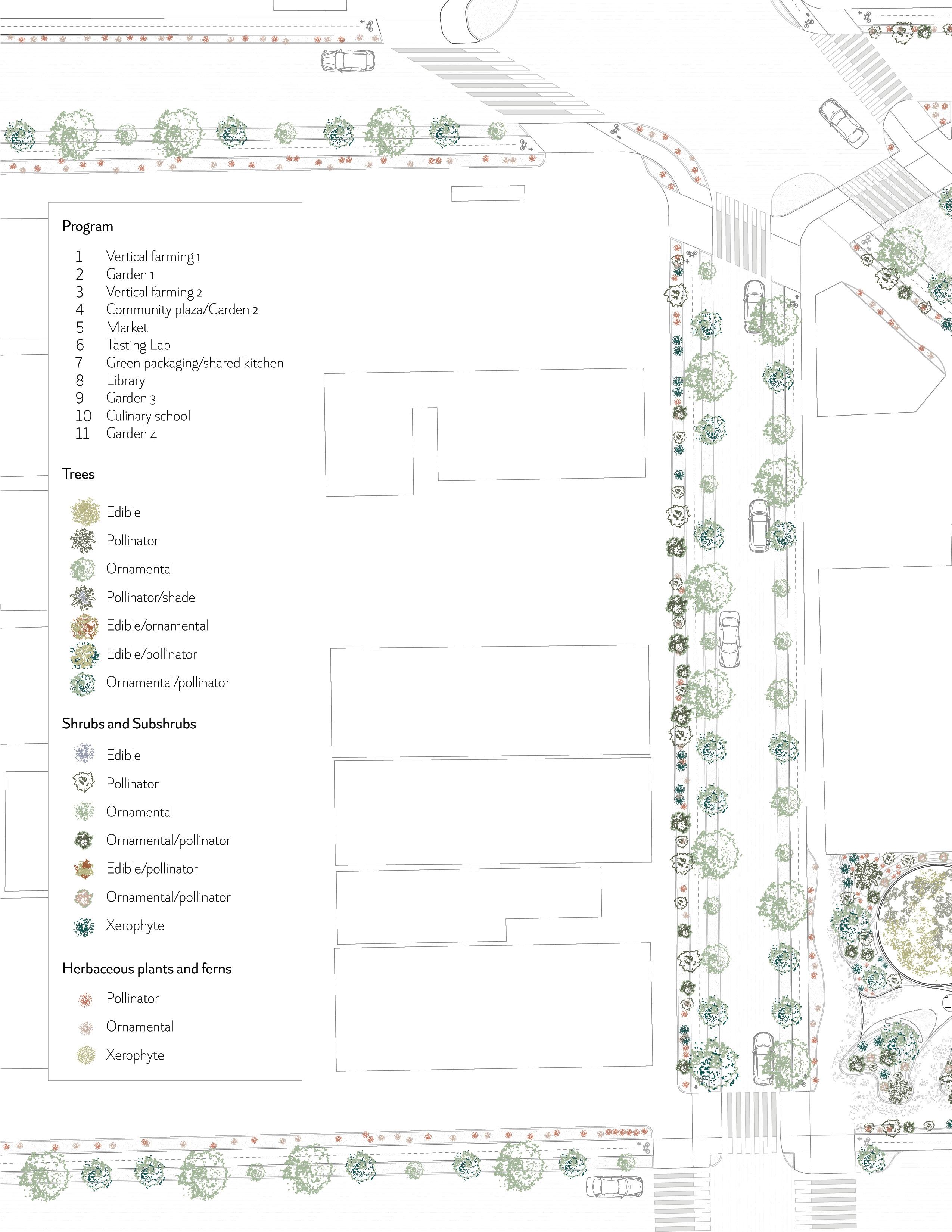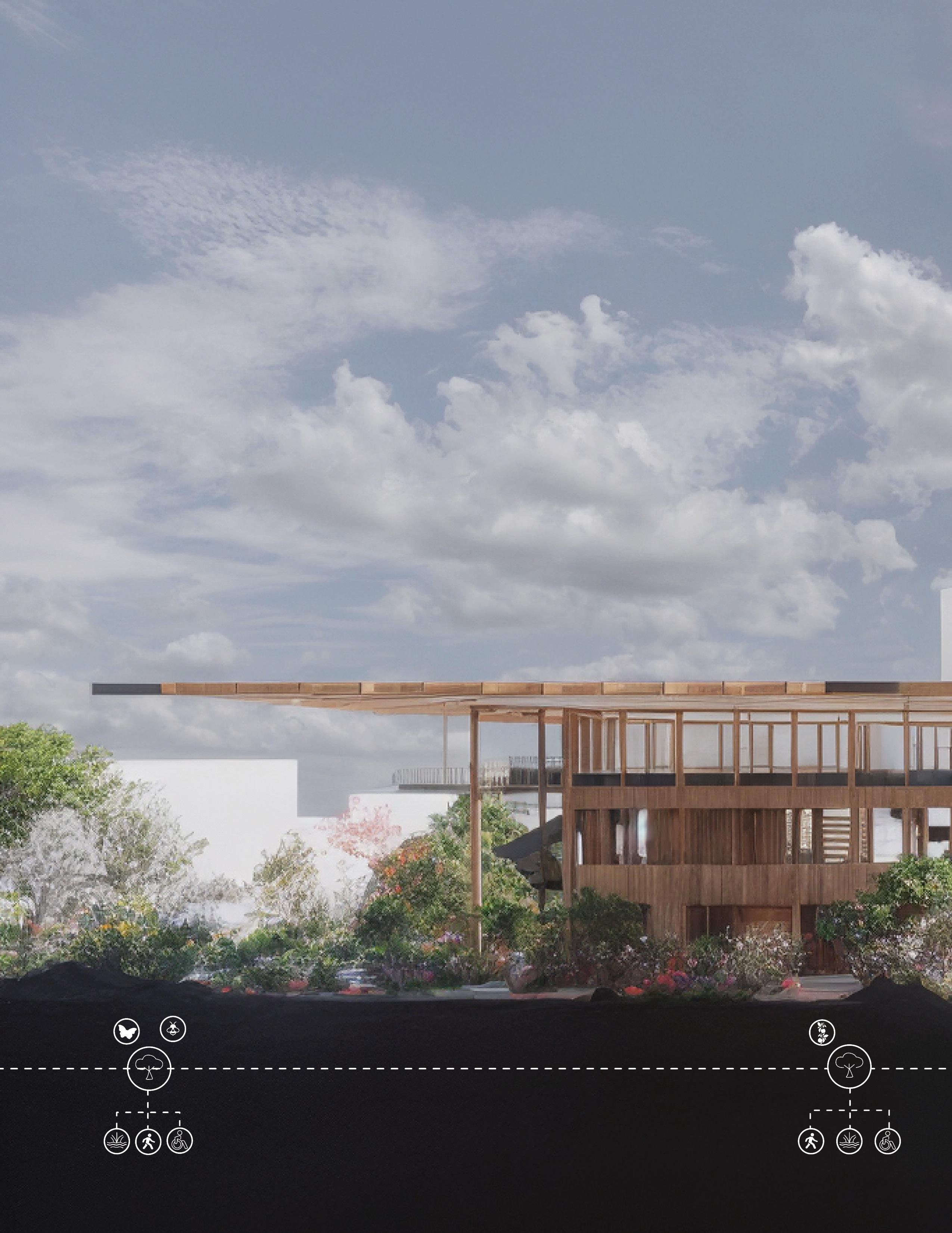 Garden 3 is defined by its microclimate: a warm, protected interior landscape where tropical ornamentals and native species coexist in a hybrid ecological composition. Under the ETFE canopy, jaboticaba, macadamia, osmanthus, and dwarf heliconias offer a lush, saturated presence, while mountain mint, bluebells, Heuchera, and buttonbush braid in a layer of ecological familiarity. The space becomes a sensory landscape with bumblebees, visited by hummingbirds drawn to tubular flowers, and animated by butterflies that respond to both native and tropical cues. Architecturally, this garden softens the interior courts with exuberant vegetation, creating a contrast between structural lightness and botanical density, a warm enclave of productivity and color.