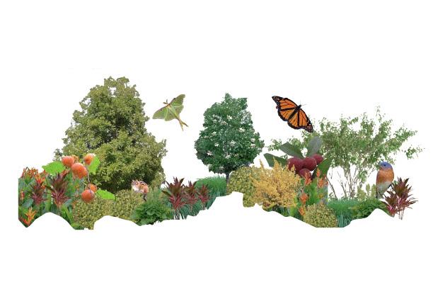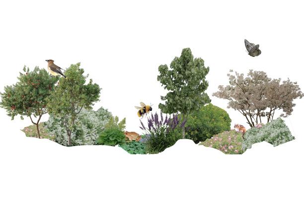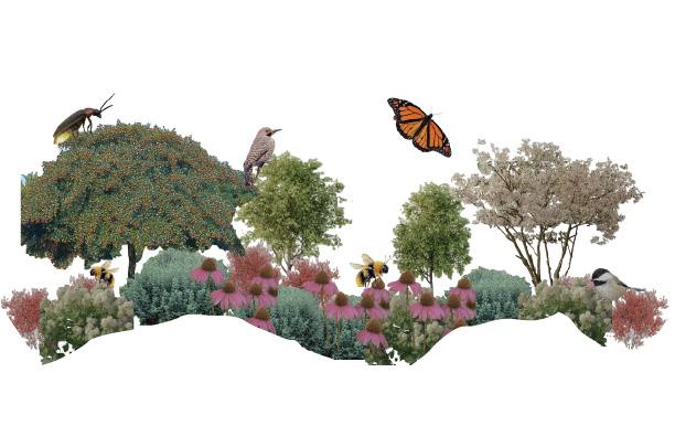 Garden 4 is the project’s ecological heart: an open, sun-filled prairie garden shaped by resilient native species that anchor biodiversity. Oaks, hawthorn, serviceberry, and basswood create a loose, airy canopy, beneath which elderberry, willow, snowberry, and steeplebush form a vibrant understory. The herbaceous layer— golden Alexanders, butterfly milkweed, bergamot, and coneflower—emerges in rhythmic drifts that shift with wind and season. This garden pulses with life: monarchs and swallowtails weave through the blooms, bees vibrate across the asters, and prairie birds forage along the sedge and dropseed matrix. Architecturally, the space becomes a living extension of the project’s structure, framing long views, capturing sun, and grounding the site in a regional, ecological narrative.
