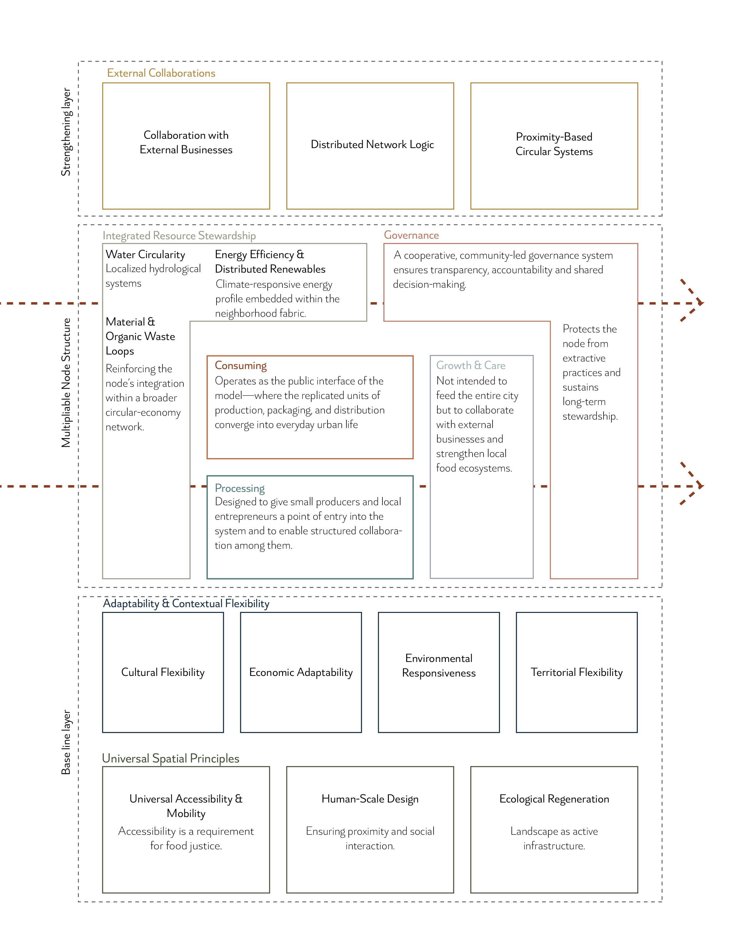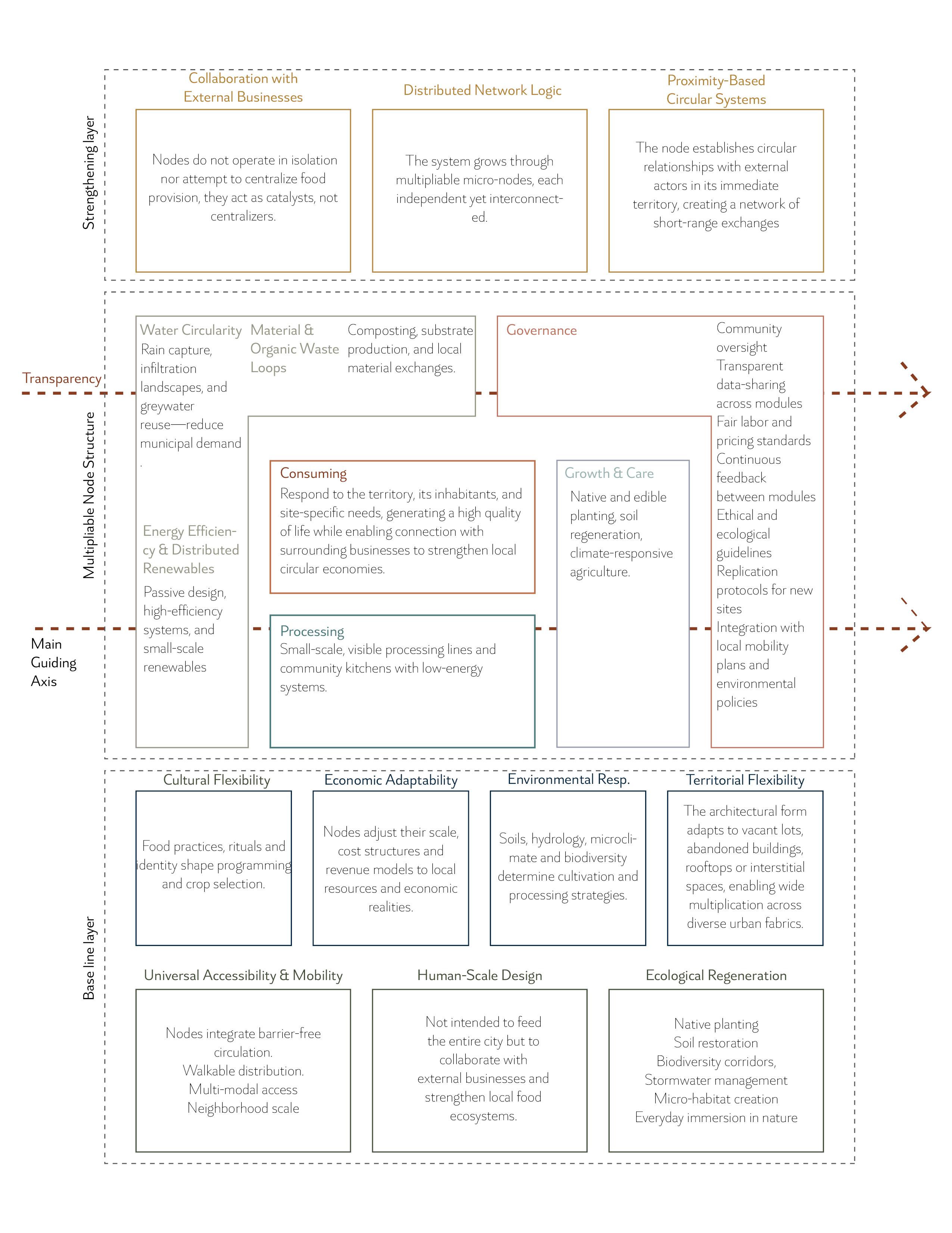 A framework for activating vacant urban spaces into collaborative micro-nodes of growth & care, processing, and consumption—built on transparency, human-scale design, ecological regeneration, climate responsiveness, and distributed collaboration.