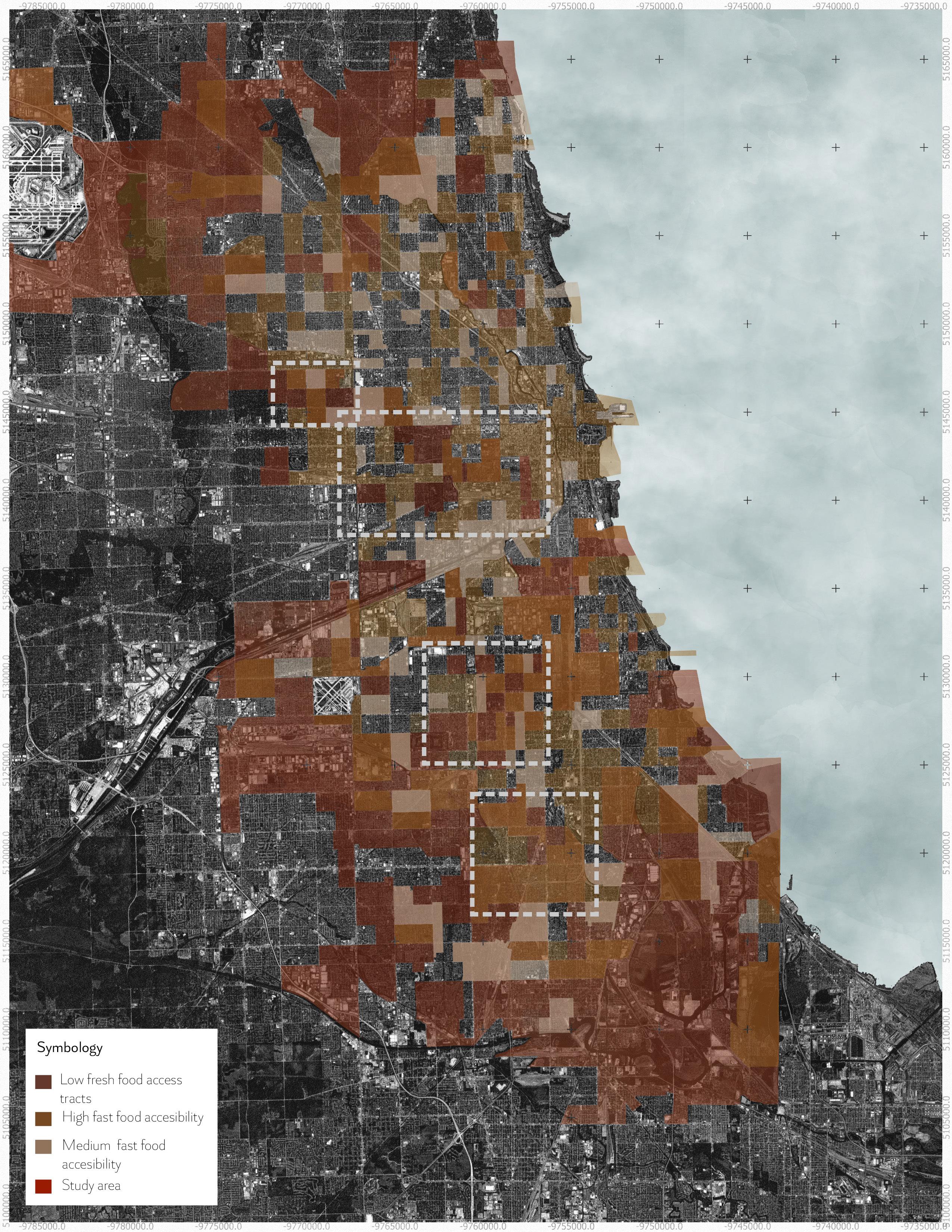 Chicago faces a persistent urban health challenge rooted in its food environment, marked by the coexistence of food deserts and food swamps that limit access to fresh and nutritious products while increasing exposure to fast food. This imbalance has long contributed to health problems such as obesity and poor nutrition within vulnerable communities, shaping a pattern of dietary inequality across the city. Overexposure to fast food and limited access to fresh food have intensified these issues, particularly in areas where both conditions overlap. There is a concentration of high and medium accessibility to fast food adjacent to our market block, combined with the absence of nearby fresh-food supermarkets—an imbalance that reinforces the need to intervene and transform this block into a healthier, more equitable urban node.