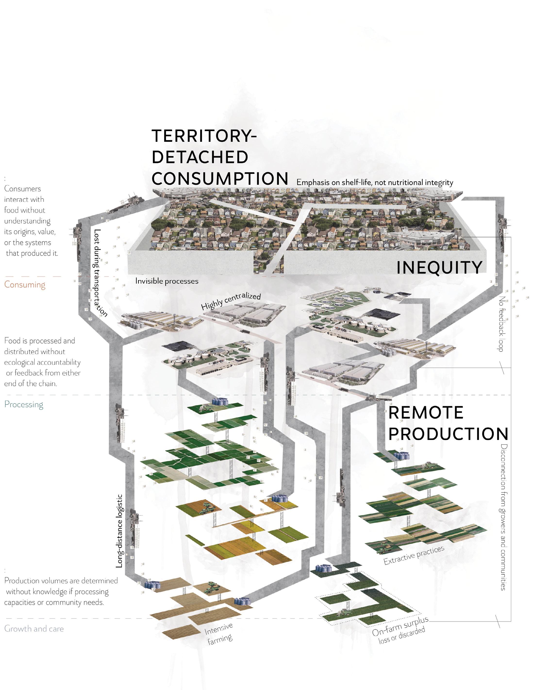The contemporary U.S. food system operates through a fragmented, extractive linear chain in which growth, processing, and consumption remain spatially and operationally disconnected. Industrial-scale production is distant from urban demand, processing infrastructures function in opaque and centralized facilities, and consumption occurs without understanding the ecological and social costs embedded in the system. This disjunction generates oversupply, long-distance logistics, food waste, environmental externalities, and limited access to fresh, nutritious food—especially in urban and low-income territories.