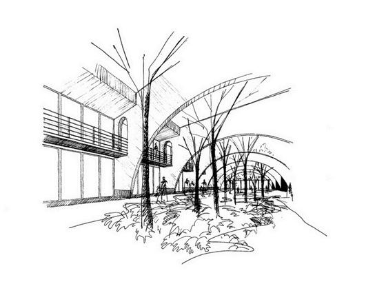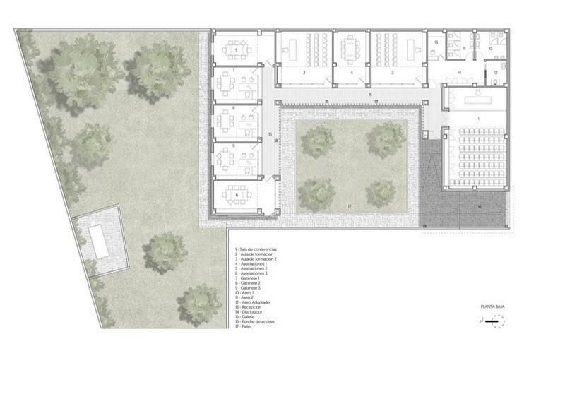 Key Spaces: Multifunctional classrooms, workshops, meeting areas, and an outdoor auditorium.
