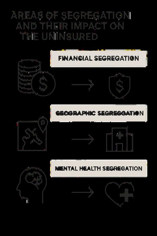 This diagram illustrates three structural forms of segregation that shape the lived reality of uninsured communities.