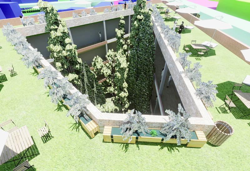 The exterior envelope is composed of brick walls, giving the building a warm, tactile, and timeless character that resonates with Chicago’s industrial and architectural heritage. In contrast, the walls facing the interior courtyard are resolved through glass framed panels, allowing full visual continuity with the central garden and ensuring that nature remains a constant presence across all levels of the project. Openings are strategically positioned to maximize natural light while controlling glare and reducing heat gain, optimizing environmental performance and user comfort.
