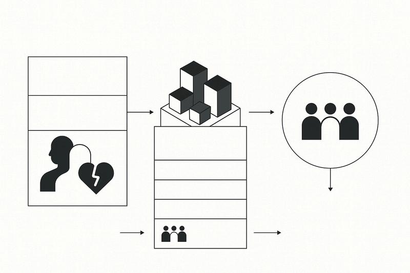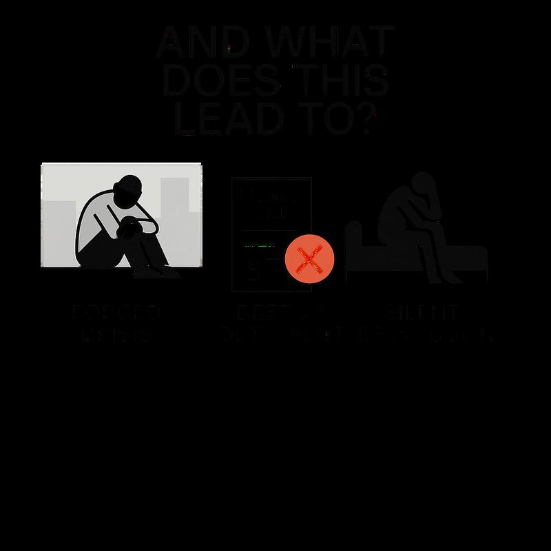 Without insurance, people avoid seeking care due to cost, leading to silent deterioration until conditions become emergencies. Emergency visits then generate overwhelming medical debt, deepening financial instability. This debt pushes individuals further away from the healthcare system, causing relapse and renewed exclusion, which restarts the cycle.