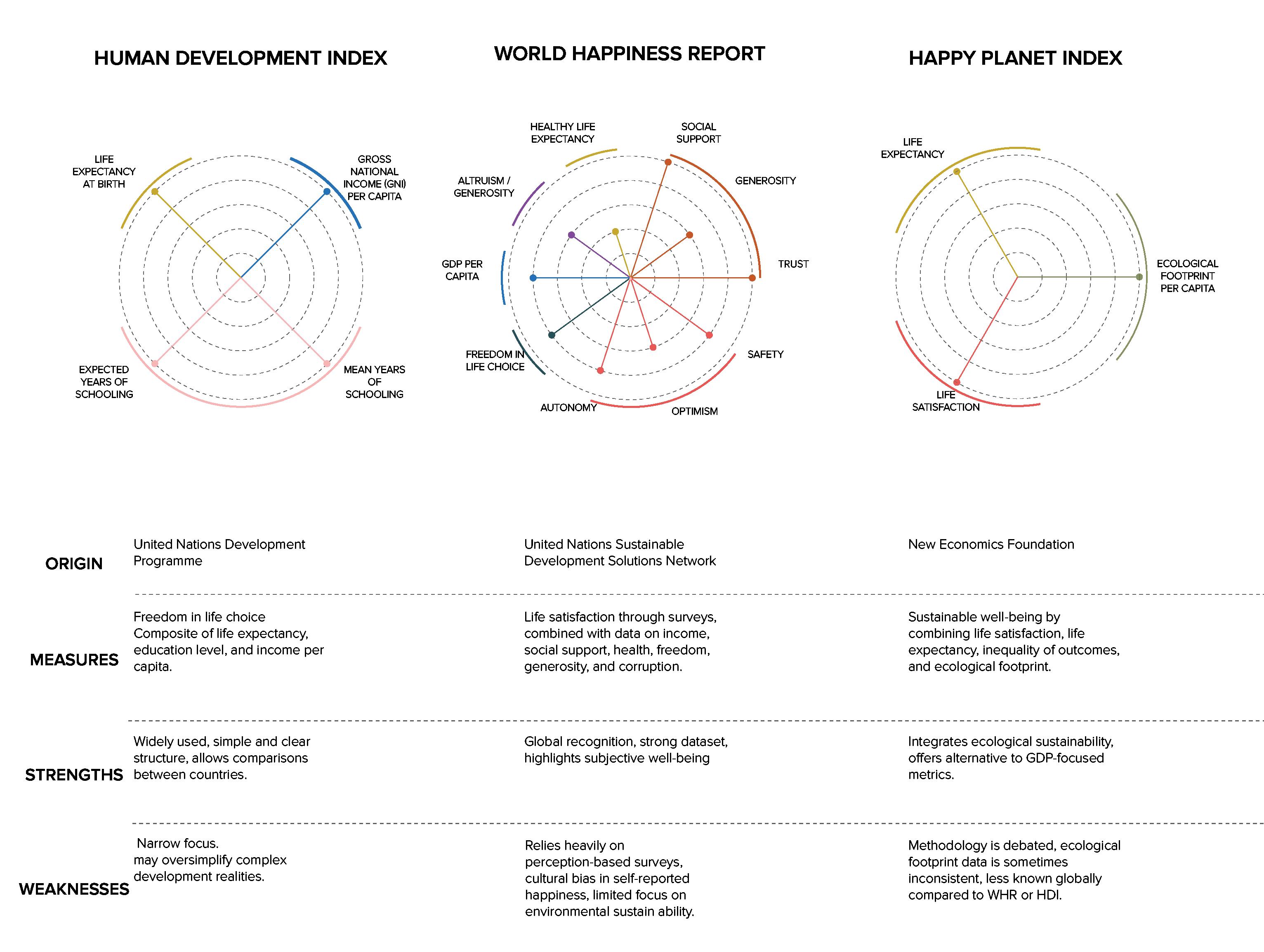 Each index emphasizes different aspects of wellbeing and uses distinct parameters, reflecting the perspective and priorities of its respective authors. Because of these variations, each index alone provides only a limited understanding of overall health. Considering them together allows for a deeper appreciation of how health and wellbeing can be defined differently depending on the methodology, focus, and values of the creators of each index.