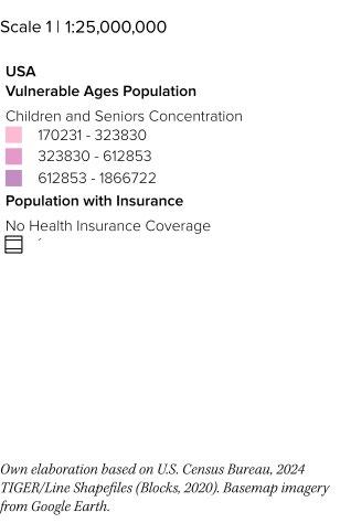 Going through the different population concentration based on age in the United States it became aware that the most vulnerable groups ended up being the two far extremes of the spectrum, the children and the seniors based on the concentration of no health insurance coverage by region in the country. Of course most are concentrated in the metropolitan areas, as well as the Southern East region.