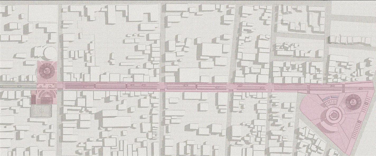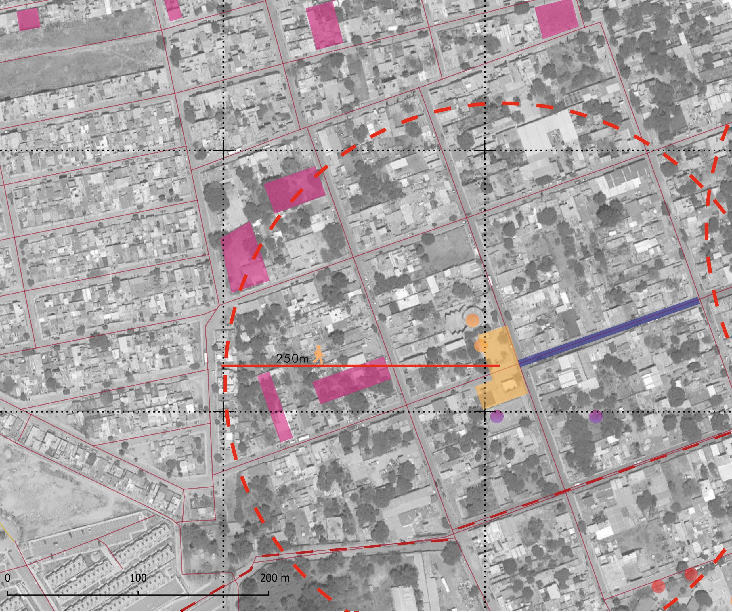 Both anchors were strategically selected after a site analysis. We came to the conclusion that these two spaces are points that have opportunities on the site, the first place to intervene is a civic plaza with a church next to it, in which, on the perpendicular street, there is a flea market once a week, For this reason, we also decided to intervene in this secondary street, since as a second anchor, there is an abandoned property with easy accessibility. On this map, an analysis was made in a 500m radius, in which it can be seen that in that area there are few social, sports, and service spaces, in short, a lack of equipment.