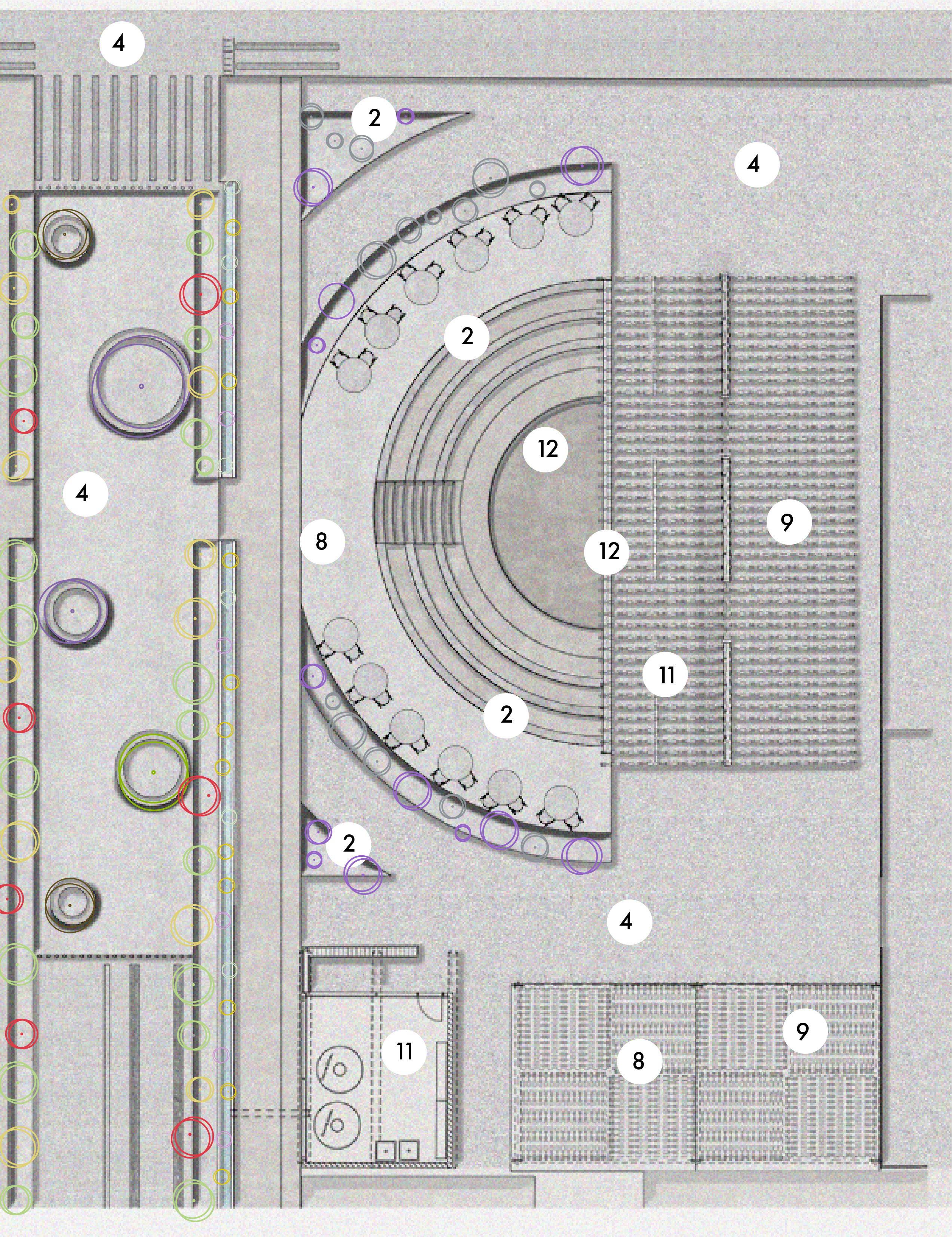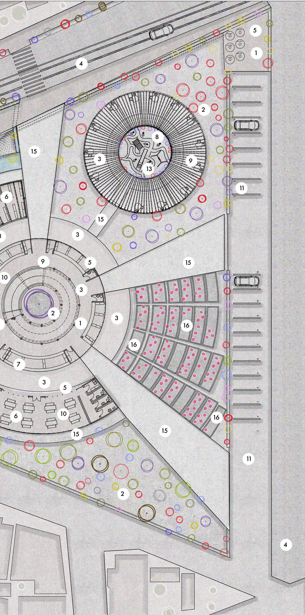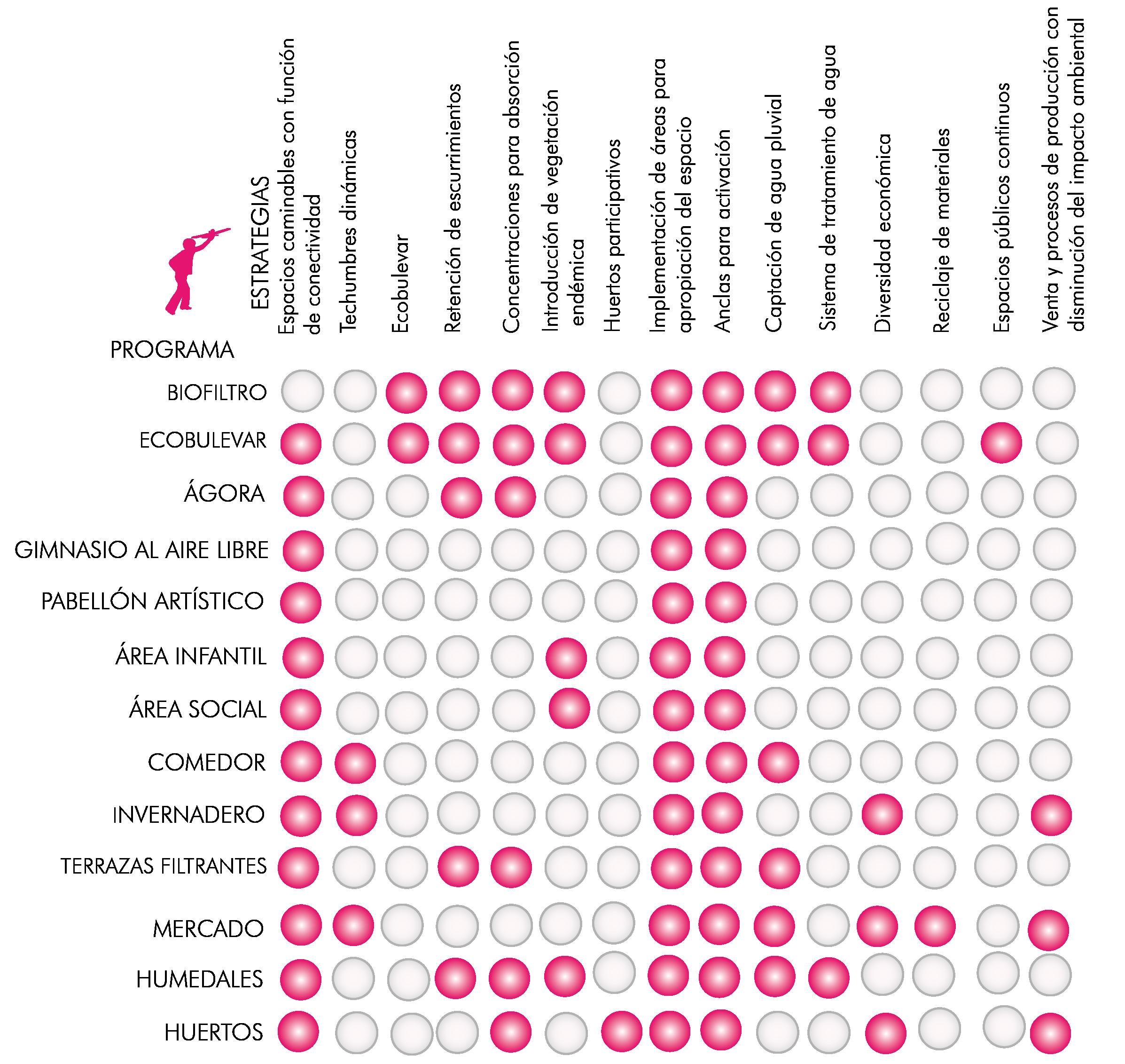 La Ruta Sabia del Agua se divide en 3 principales zonas, la primera está enfocada a lo social; en la cual de acuerdo al sitio, es un lugar de encuentro, por lo que implementamos áreas infantiles, ágora, gimnasio, etc. La segunda intervención está más enfocada en lo comercial y de producción, la cual es más amplia en el programa, tiene espacios para cultivar, un mercado para vender, invernaderos, pero al mismo tiempo un espacio de convivencia para que la comunidad se relacione con el sitio. Estas dos zonas están conectadas a través ecobulevar, en el cual su principal objetivo es captar el agua de las escorrentías y tratarla.