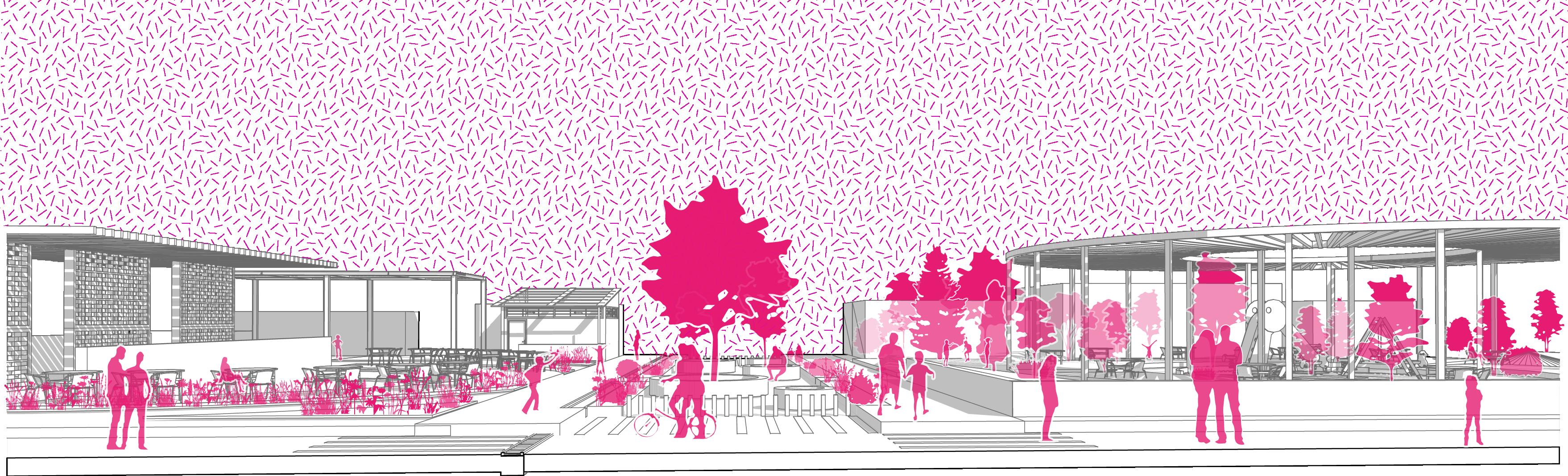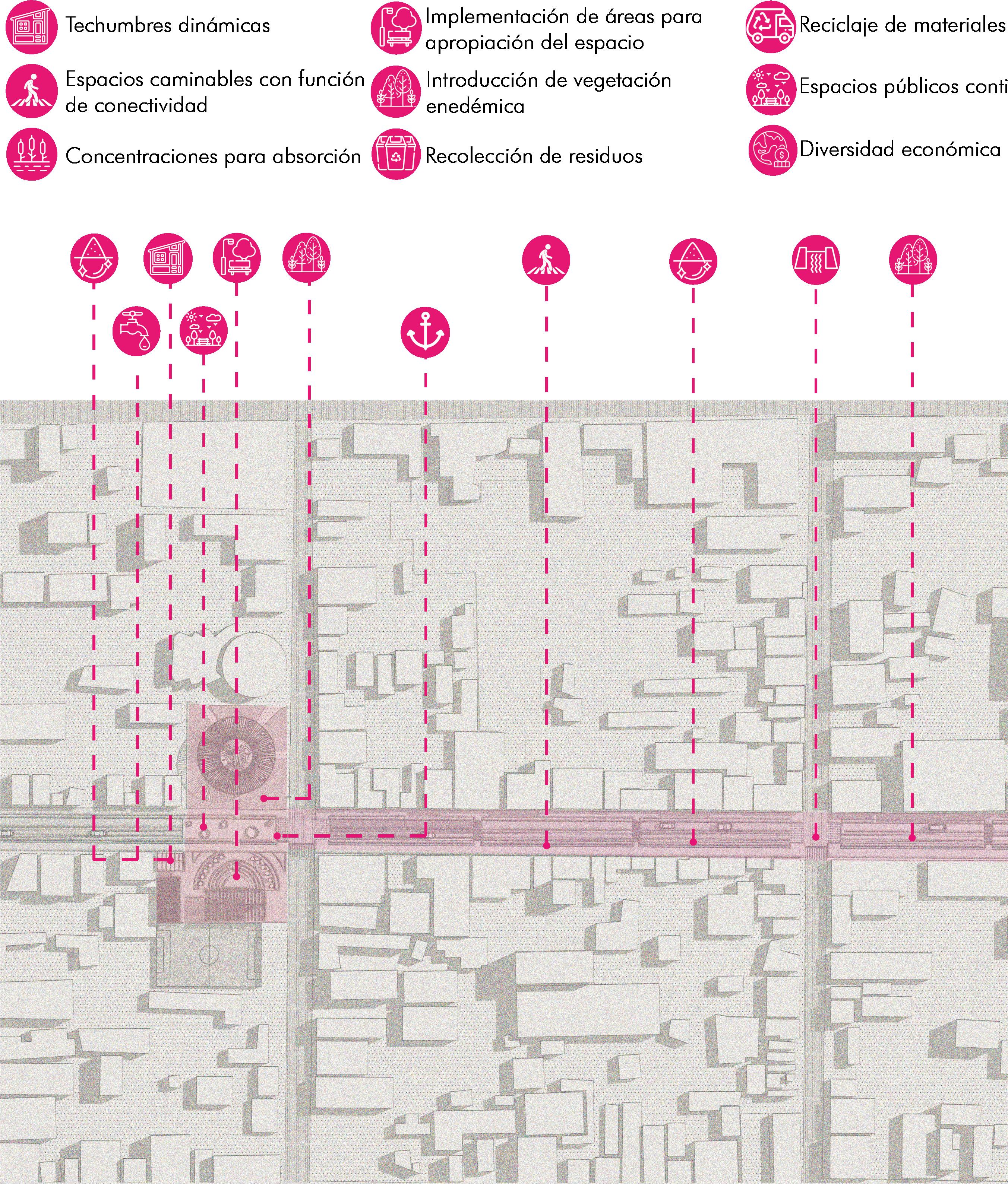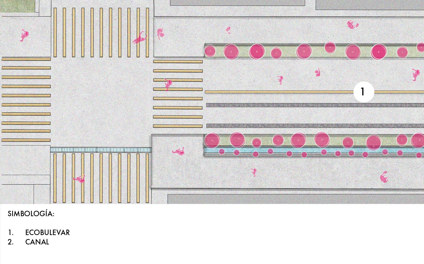 The Water Wise Way is divided into 3 main zones, the first is focused on the social; in which according to the site, it is a meeting place, for which we implemented children’s areas, agora, gym, etc. The second intervention is more focused on trade and production, which is broader in the program, it has spaces to cultivate, a market to sell, greenhouses, and at the same time a space for coexistence for the community to relate to the environment. place. These two zones are connected with an eco-boulevard, in which its main objective is to capture runoff water and treat it.
