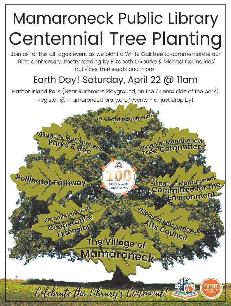 On Earth Day, Saturday, April 22 at 11 a.m., in continued celebration of 100 years of service to the community, Mamaroneck Public Library will plant a White Oak tree in Harbor Island Park. The tree is being graciously donated by the Village of Mamaroneck (VoM) Tree Committee in coordination with VoM Parks & Recreation. The Village of Mamaroneck’s Poet Laureate Michael Collins and poet Elizabeth O’Rourke - both of the VoM Arts Council - will perform a poetry reading. VoM Committee for the Environment, Pollinator Pathway, Cornell University Cooperative Extension and the