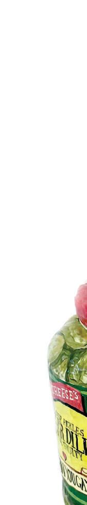 A cucumber-dunking legacy that began in a back yard near Hamilton in 1929 draws from a family recipe brought over from Rus sia, cour tesy of the great- great- grandmother of Toronto visual ar tist Jonah Strub. “We always had an entire fridge of Strub’s at home,” he recalls, “and that’s what my family would bring to a par t y instead of a bot tle of wine ” The busines s was sold of f in 2008, then rescued in 2012 by Whyte’s, a company founded by Montreal couple Sam and Esther Witenof f in 1936 and whose own factor y for tunes have now soured