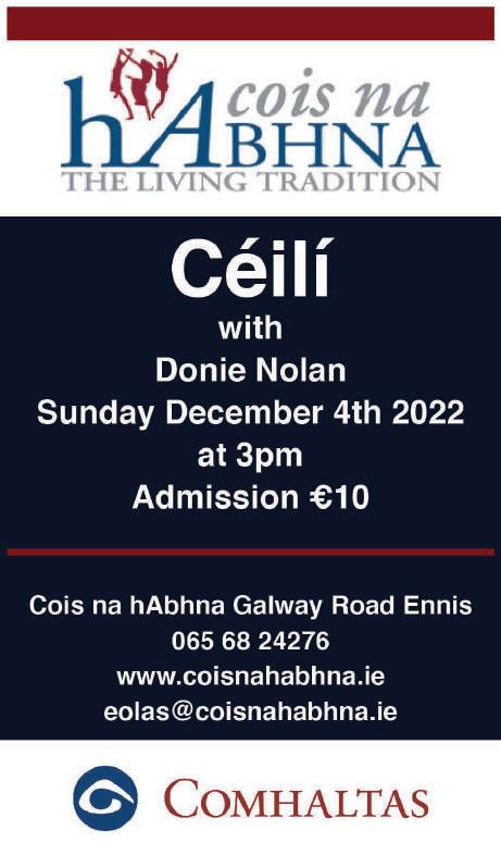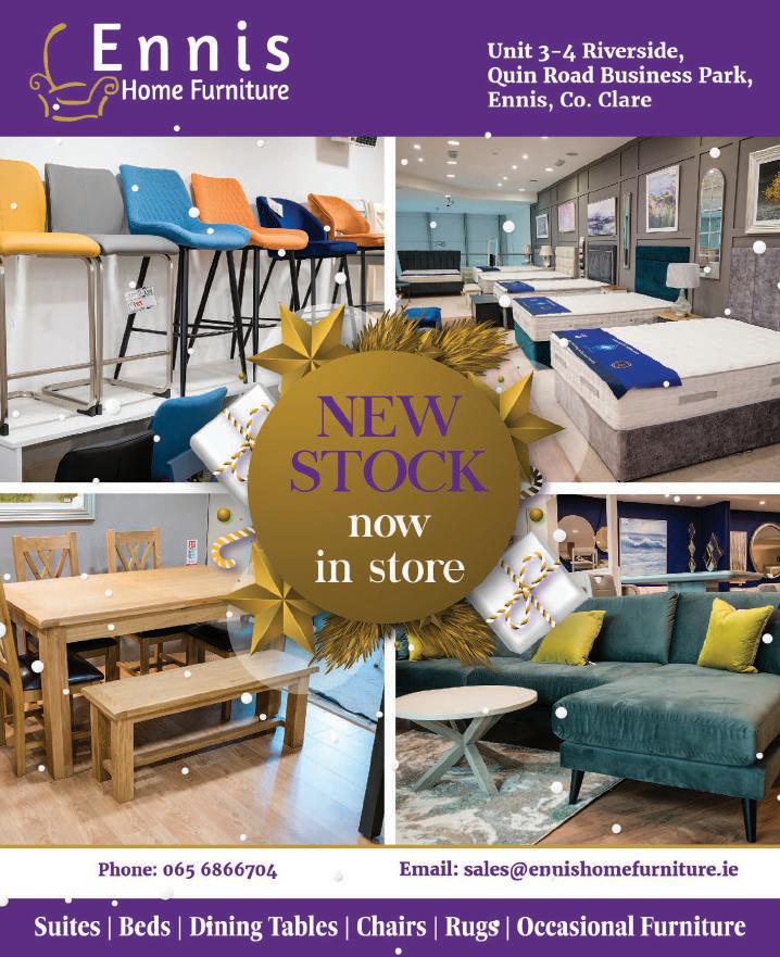 3 NEWS THURSDAY, DEC 1 2022 Christmas Village now Open! Kilrush Rd, Ennis Ph: 065 6797040 Open 9.30am - 6pm Monday - Saturday. Sunday 1pm - 5.00pm interiors Visit our website www.homegallery.ie CHRISTMAS TREES & GARLANDS NOW IN STOCK