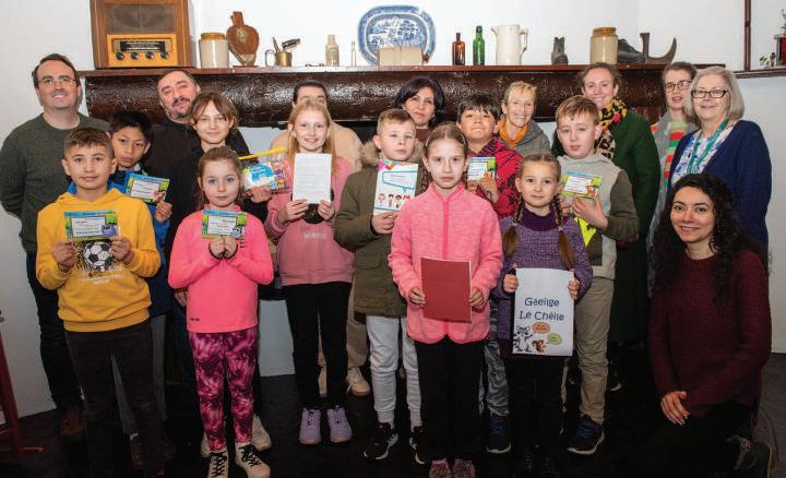 l GAEILGE LE CHEILE: Limerick and Clare Education and Training Board staff presenting an Irish Resource pack for 4th class children in Ennis Educate Together National School to encourage Irish conversation in the home. Some of the parents attend English classes provided by Limerick and Clare Education and Training Board. Children in the photo are from different classes and are from Ireland, Ukraine, Syria, Taiwan and Slovakia Photo by Michael Kearney