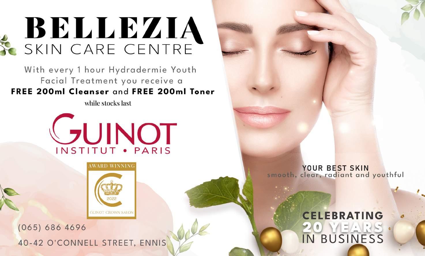 BELLEZIA Skin Care Centre, 42 O'Connell Street, Ennis has been awarded the status of Guinot Crown Salon 2022. This coveted title celebrates the highest achieving Guinot Sa lons, Spas and Health Clubs in the UK and Ireland who demon strate success, dedica tion and loyalty to the brand. Guinot is an award-winning her itage skincare brand, delivering bespoke skincare prescriptions and patented treatment methods.