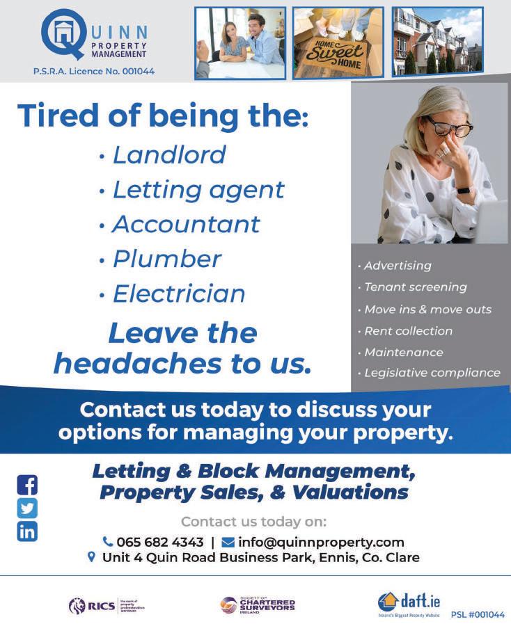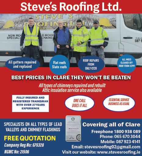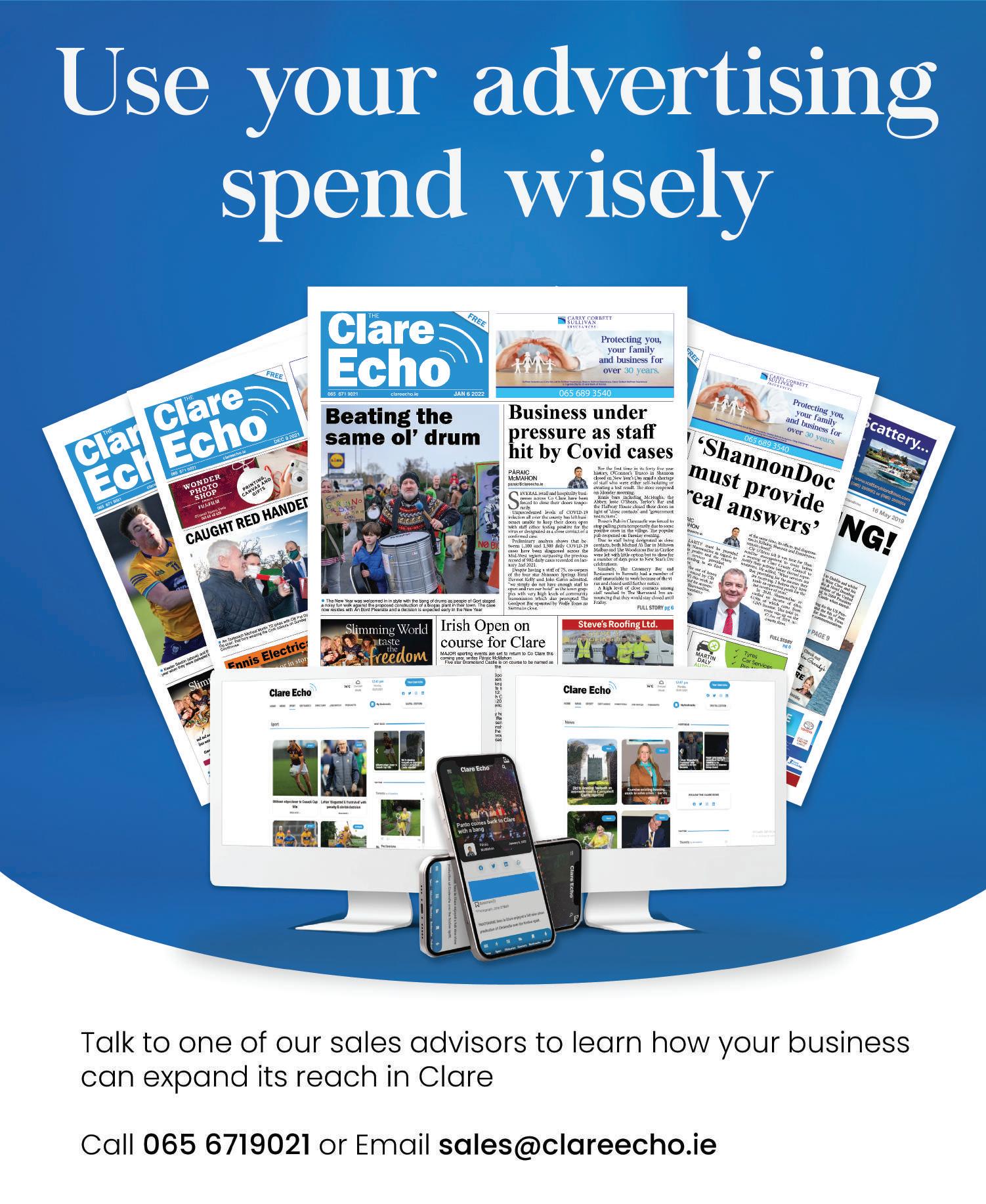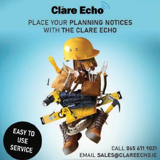 ciaran.coote@clareecho.ie SALES or niall@clareecho.ie This publication supports the work of the Press Council of Ireland and Office of the Press Ombudsman, and our staff operate within the Press Council’s Code of Practice. You can obtain a copy of the Code, or contact the Press Council, at www.presscouncil.ie, Lo-call 1890 208 080 or email: info@presscouncil.ie