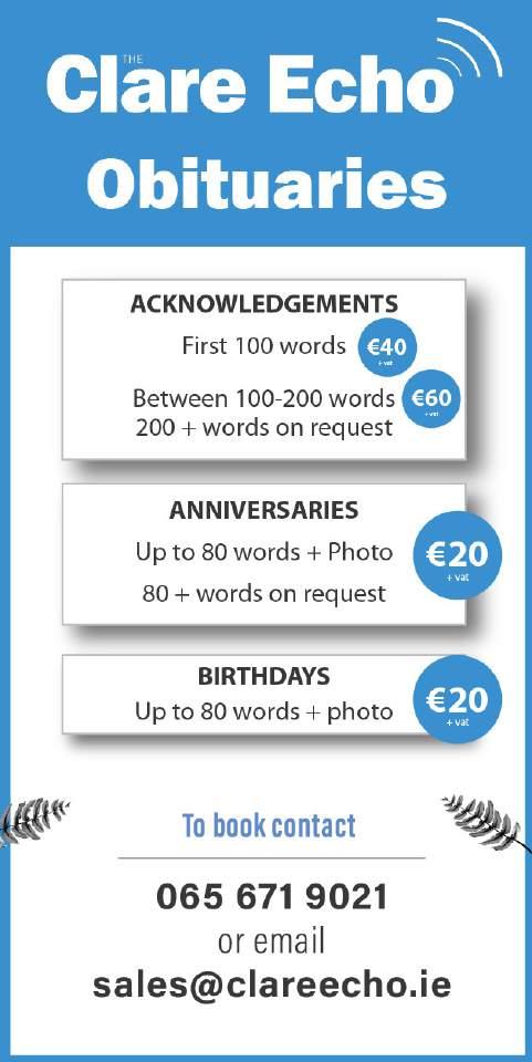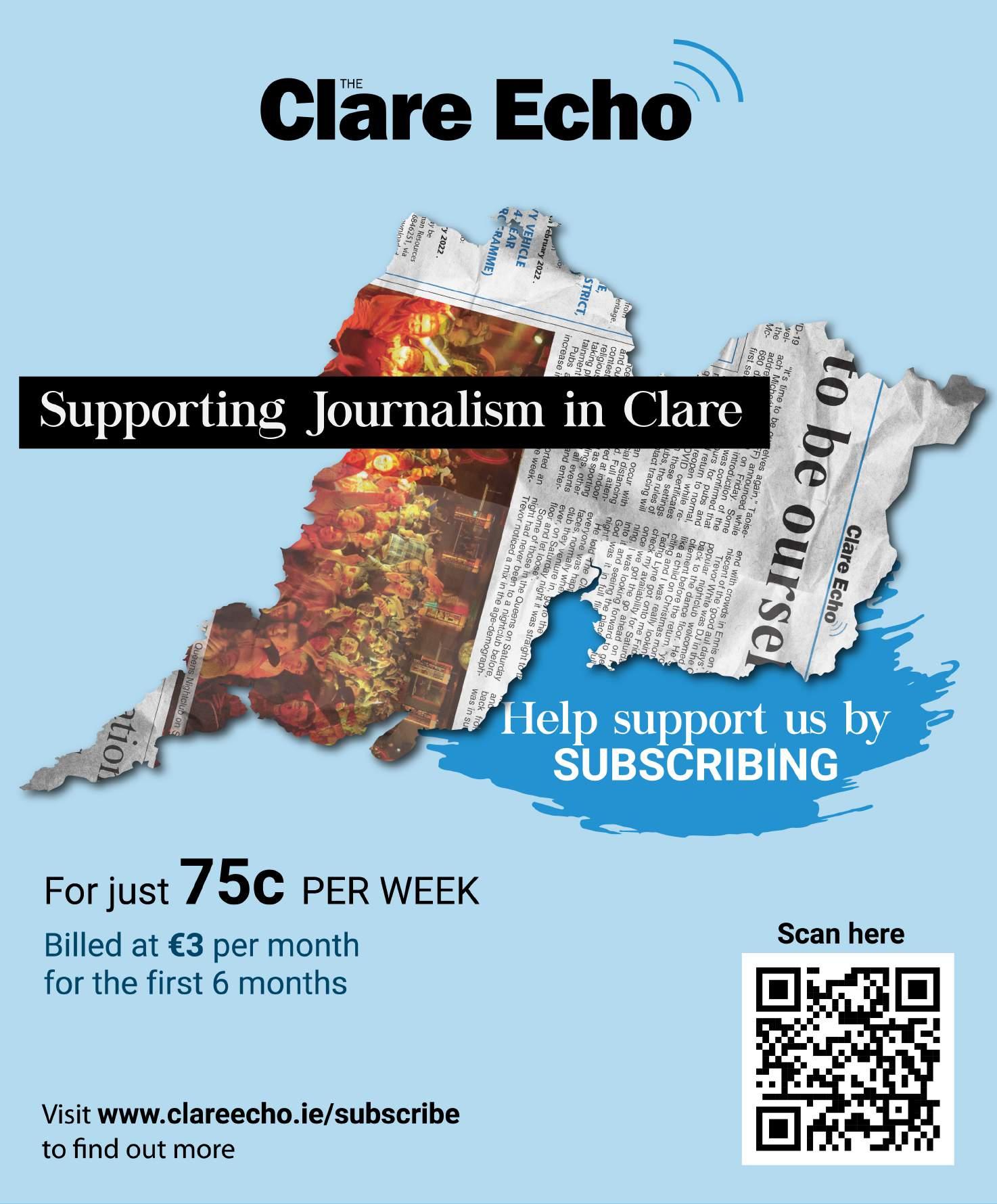 36C Abbey Street, Ennis, County Clare Telephone: 065 671 9021 Email: editor@clareecho.ie paraic@clareecho.ie NEWSDESK news@clareecho.ie Email: niall@clareecho.ie SALES or sales@clareecho.ie This publication supports the work of the Press Council of Ireland and Office of the Press Ombudsman, and our staff operate within the Press Council’s Code of Practice. You can obtain a copy of the Code, or contact the Press Council, at www.press council.ie, Lo-call 1890 208 080 or email: info@presscouncil.ie 2 NEWS THURSDAY, OCT 27 2022