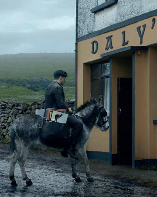 from Kilfenora appears at the mid-point of the ad, emerging from a crowd wearing a flat cap and suspenders. He shouts “Hey, Squarespace man!”, after Keoghan as he continues on his journey on the donkey. The Dubliner then delivers one final laptop to a shepherd before riding the white donkey off a cliff and gradually rising into the sky. The often-photographed, uninhabited cliff-top cottage in Doolin makes an appearance near the start of the ad.