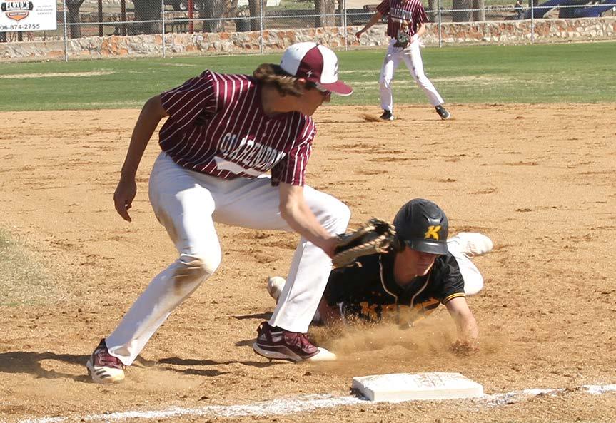 Clarendon’s Levi Gates tries to tag a Kress runner out at first base during the Broncos’ home game last week.