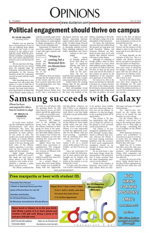 students constantly argue about ideological diversity, pins and their stances on policies ranging buttons expressing partisan from taxation to contraception support adorn shirts and backto illegal immigration, all hot packs. At tables lining Driscoll Bridge, organizations continue topics on the campaign trail. Expressions of support for to encourage political activity. one of the candidates or parties Fliers soliciting volunteers are is met with eager response and widely distributed and attract students to join camexchange of paigns. viewpoints. These means P o l i t i c a l “Winter is of keeping political news is coming, but a fervor alive show no spread like signs of significant gossip, pro- thousand flowslowing. Just look at viding ample ers bloom here the writing on the nourishment wall, or, rather, the for the appe- at DU.” chalk on the pavetite of any ment. No one can aficionado. One never feels out of place tread the steps leading to Sturm delving into the political arena Hall without noticing a certain at this school, and I’ve yet to name repeatedly etched in blue. hear a person claim they won’t Murals depict the swirling be performing their civic duty Obama logo on the sidewalk come November. around campus as well. Winter is coming, but a Such surroundings reveal thousand flowers bloom here that involvement has survived at DU. Like a rich tapestry of the hype and hubbub of the