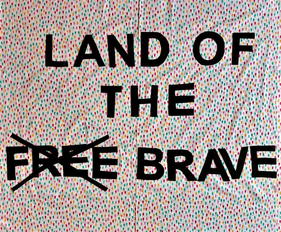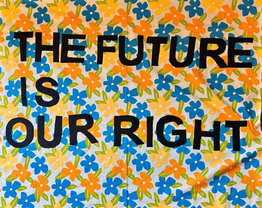 For the workshop portion of our class, students worked in two groups to create protest banners using instructions from Han Sifentes’ Protest Banner Lending Library. Their banners slogans were “The Future is Our Right” and “Land of the Free Brave.”