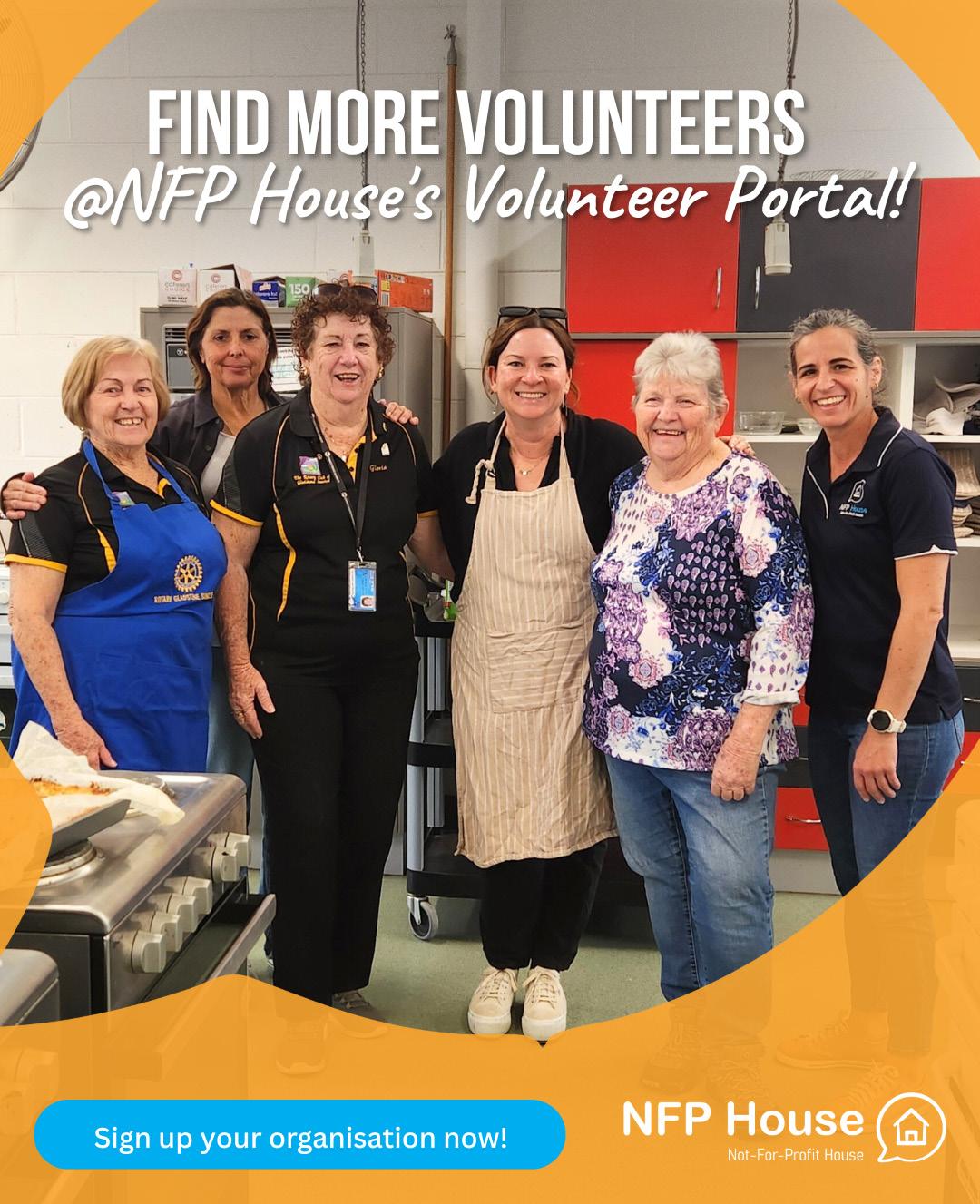 Don’t miss your chance to tap into a growing network of helpers. Visit www. Portal.nfphouse.org.au to register your organisation today. If you need any assistance, call 0460 792 812 or email volunteer@nfphouse.org.au
