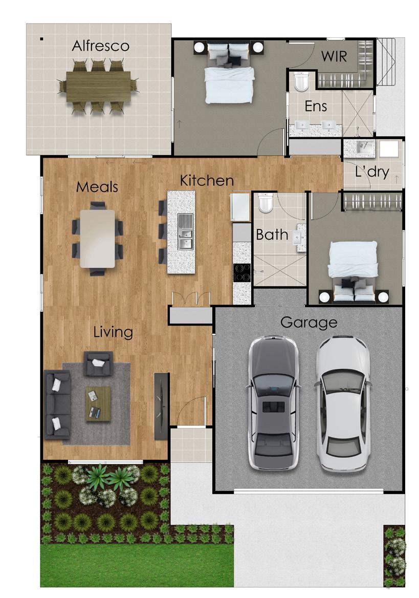 The Cockatoo Floorplan offers spacious open-plan living that flows effortlessly onto a private alfresco courtyard. Featuring 2 bedrooms, 2 bathrooms, and a 2-car garage, it is ideal for those looking to downsize near the coast.