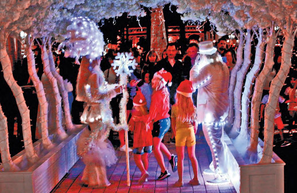The Kozlov family from Boca Raton walks through the illuminated tree canopy and past the Ice Queen and Ice King during ‘Light the Lights,’ Mizner Park’s annual tree lighting ceremony held Nov. 19. The festivities will be open to the public through the holiday season. Tim Stepien/The Coastal Star Yuletide, Hanukkah festivities, Page AT26