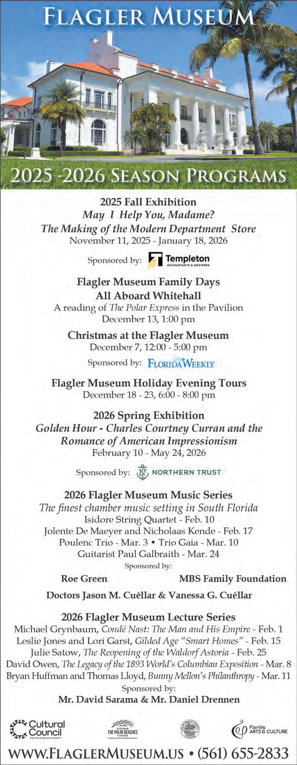 10/21 - Do Good Delray 2025 - Cocoa Alchemy: A Whiskey & Chocolate Tasting Experience at Delray Beach Library, 100 W Atlantic Ave. Age 21+. 5:30 pm. $50. Registration: 561-266-0798; delraylibrary.org 10/21 - Heritage Lecture - Preserving Local Treasures: Lake Worth Lagoon w/ Kylie Ariotti presented by the Delray Beach Historical Society at Old School Square, Crest Theater Suite C, 51 N Swinton Ave. 6 pm. $15/ non-members. Registration: 561-274-9578; delraybeachhistory.org