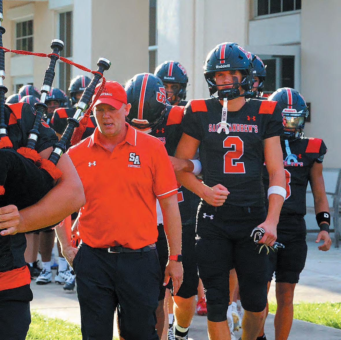 Senior Chris D’Angelo leads the Saint Andrew’s football team onto the field in August